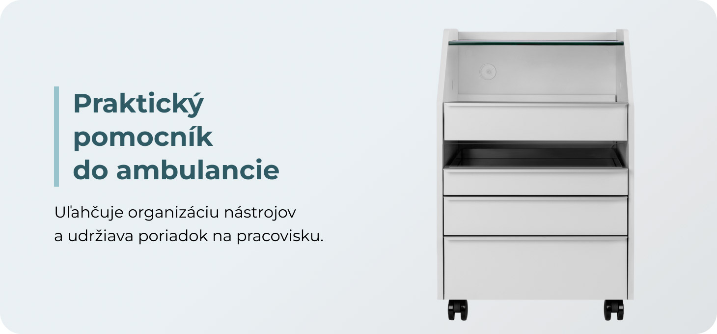Podiatrický asistent 984 je jednoduchý a funkčný kus nábytku určený pre podiatrické ordinácie, kozmetické salóny a iné ošetrovacie priestory, kde je dôležitá dobrá organizácia pracoviska. Uľahčuje ukladanie nástrojov, kozmetiky a vybavenia, čím prináša do interiéru poriadok a estetiku.