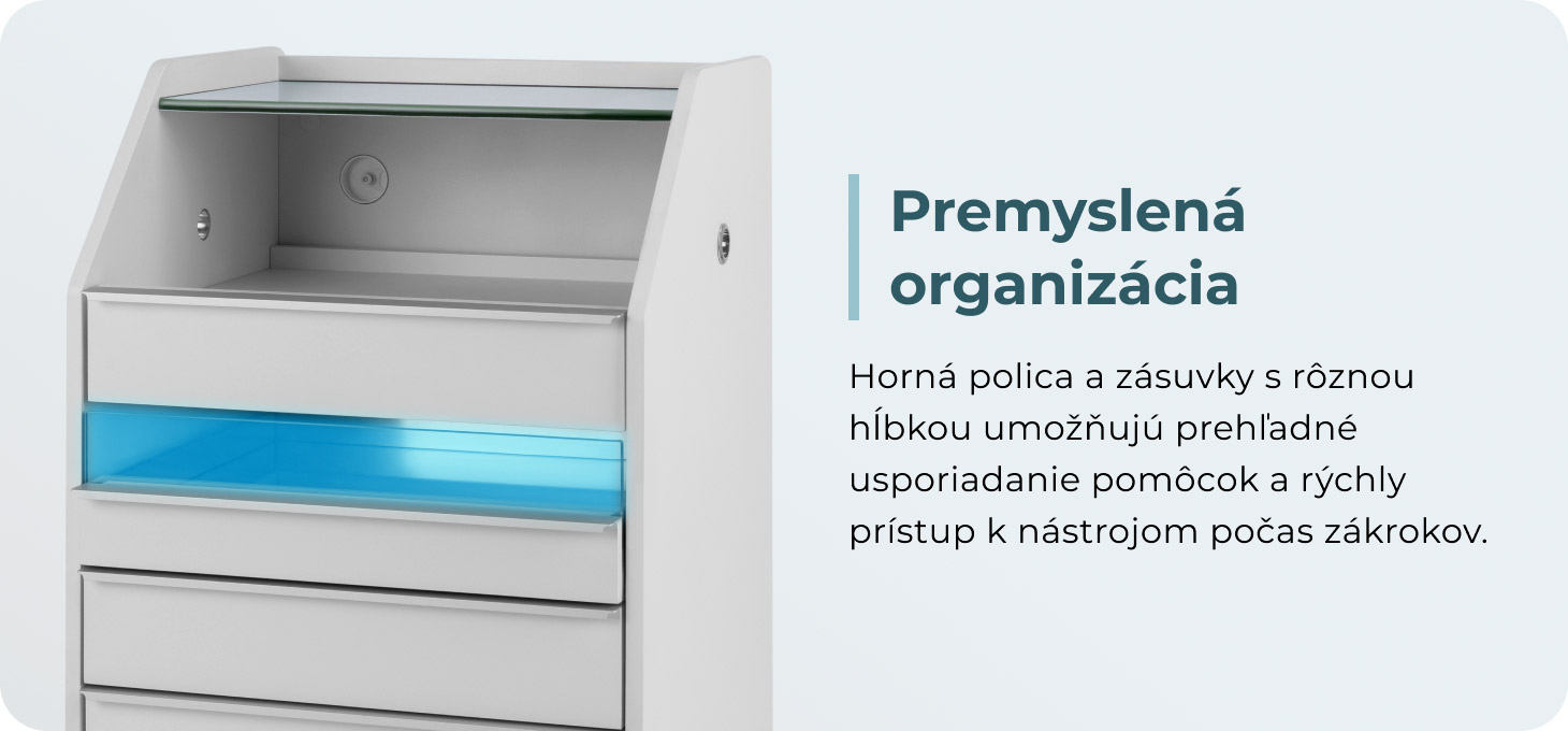 Úzka horná sklenená polica umožňuje pohodlné ukladanie najčastejšie používaného príslušenstva. Skrinka je vybavená štyrmi zásuvkami rôznych veľkostí, čo uľahčuje usporiadané ukladanie nástrojov a kozmetických výrobkov. Špeciálny vnútorný organizér uľahčujú lepšiu organizáciu nástrojov, zabezpečujú rýchly prístup k nevyhnutnému príslušenstvu a zvyšujú komfort počas ošetrení. Výška hornej otvorenej zásuvky umožňuje umiestniť nevyhnutné vybavenie, ako je fréza s absorbérom.