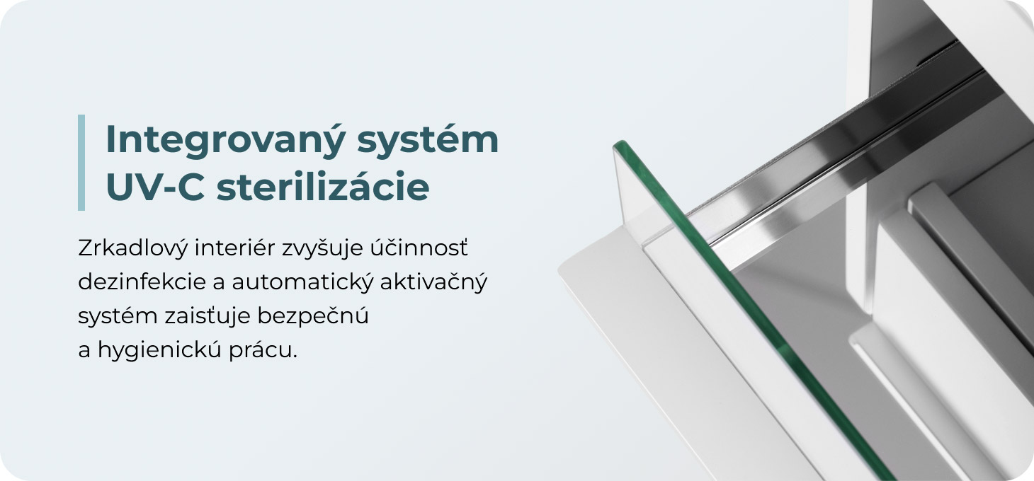 Zásuvka s integrovanou UV lampou umožňuje hygienické zabezpečenie nástrojov medzi jednotlivými ošetreniami. Zrkadlová úprava vnútorného priestoru podporuje rovnomerné pôsobenie UV žiarenia, čím zvyšuje účinnosť sterilizácie. Systém sa aktivuje výhradne po úplnom zatvorení zásuvky, čo podporuje bezpečné používanie, zachovanie vysokých hygienických štandardov a prispieva k predĺženej životnosti UV lampy.