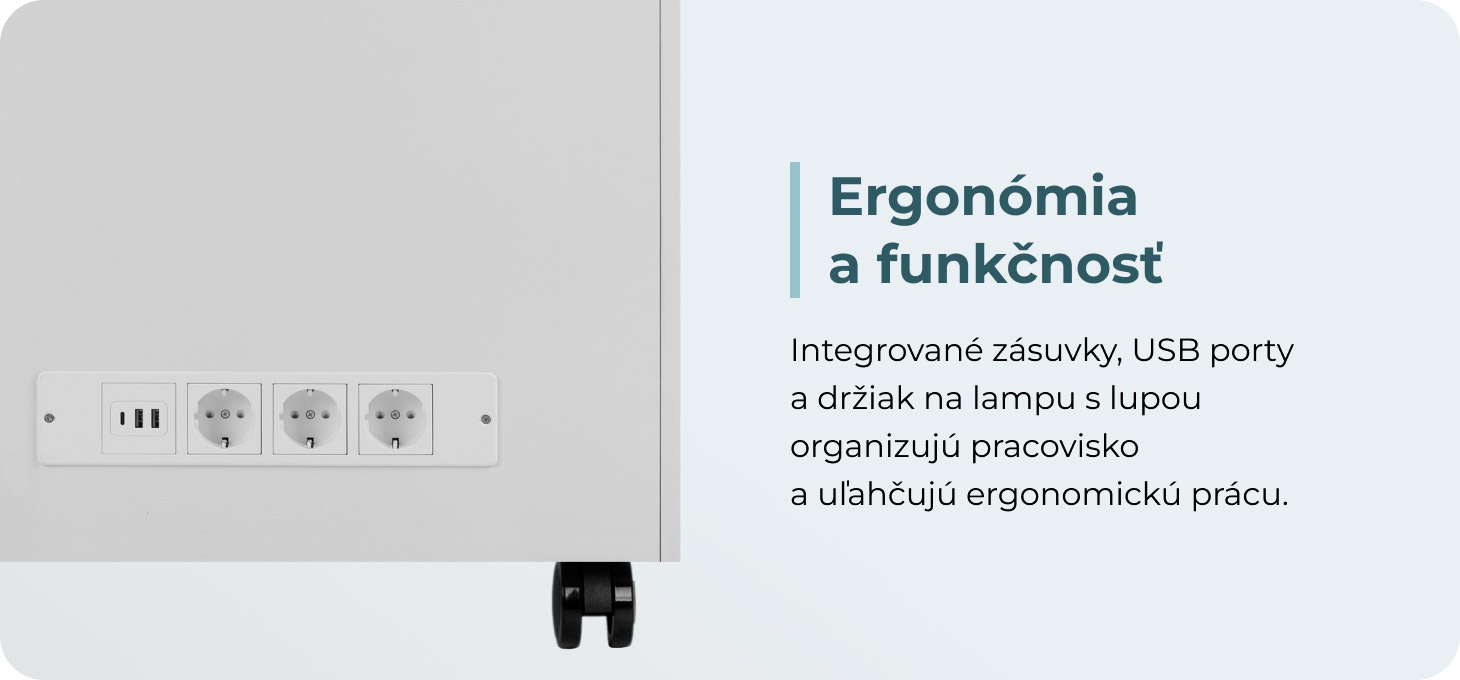 Asistent má zadný panel s tromi sieťovými zásuvkami, dvoma USB portmi a jedným USB-C portom, čo umožňuje pohodlné pripojenie rôznych typov zariadení. Prechodky káblov umiestnené v stenách v blízkosti hornej zásuvky pomáhajú udržiavať poriadok. Integrovaný držiak zväčšovacej lampy umožňuje bezpečné upevnenie ramena lampy v blízkosti ošetrovanej oblasti bez zabratia miesta na pracovnej doske, čo prispieva k presnému osvetleniu a ergonomickej práci.