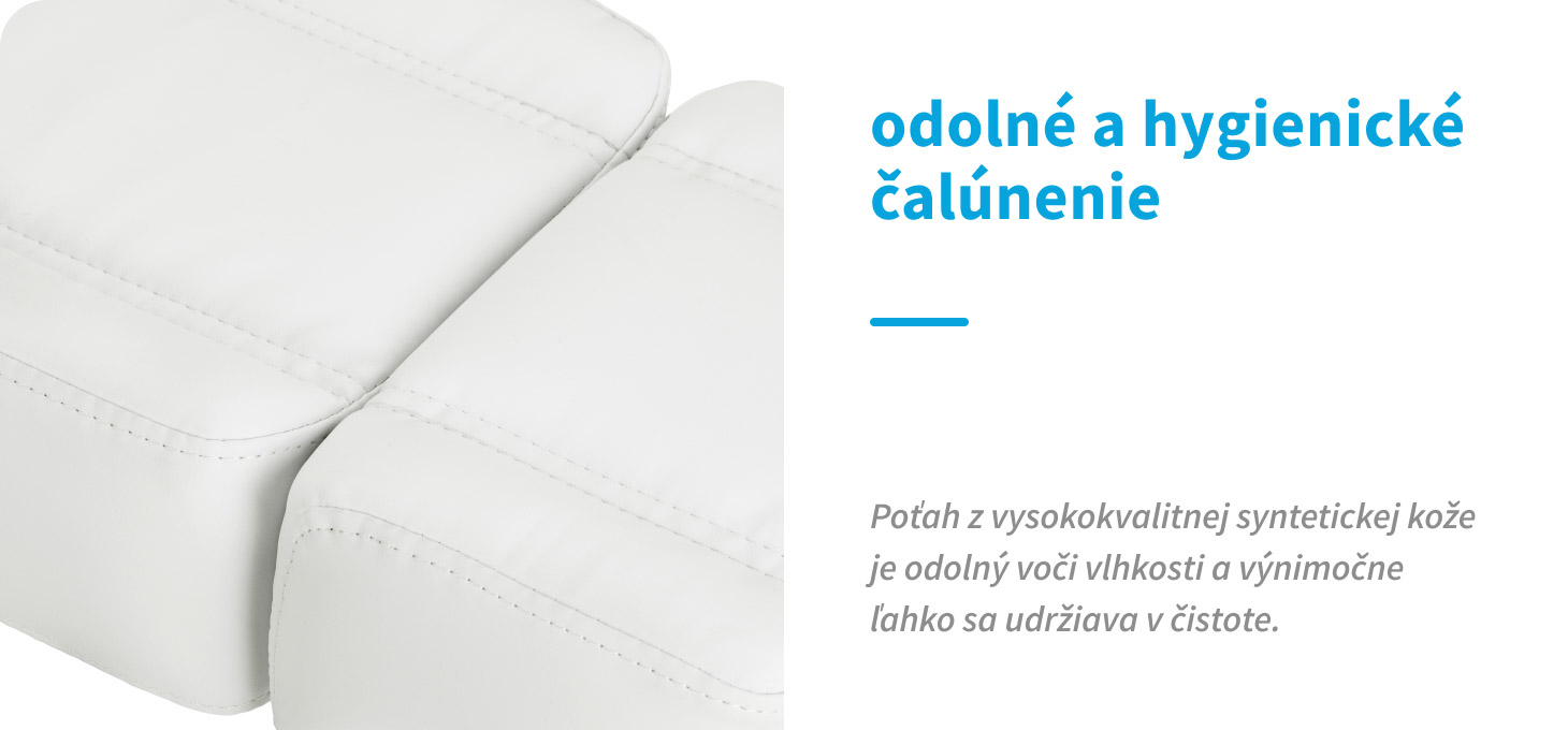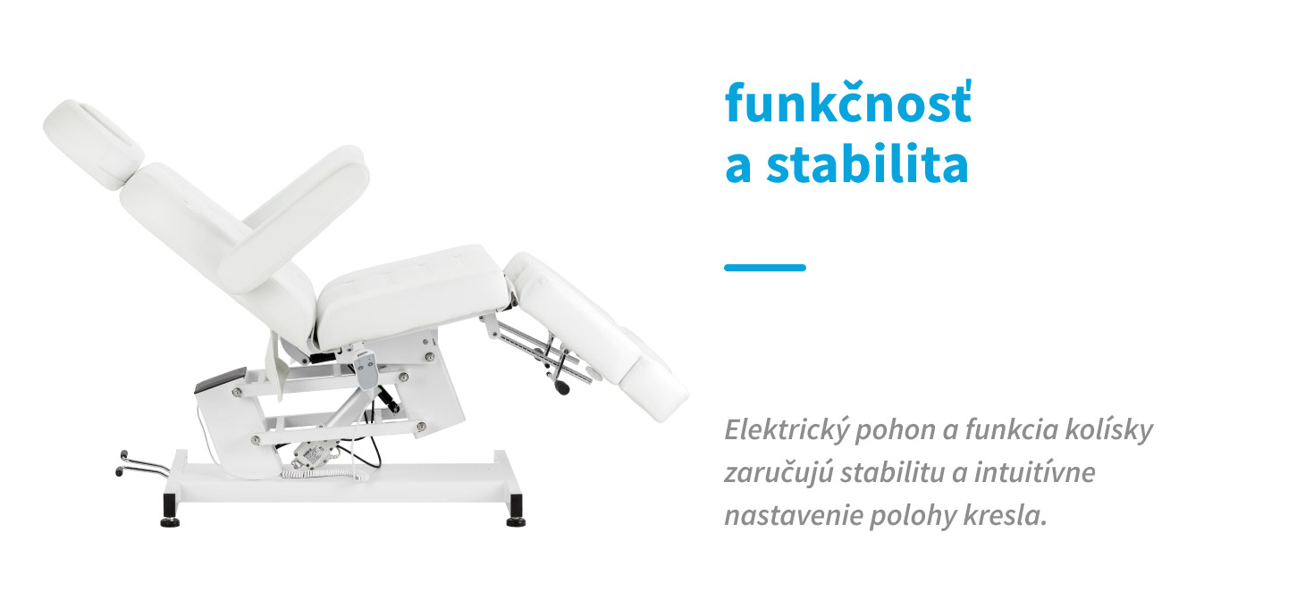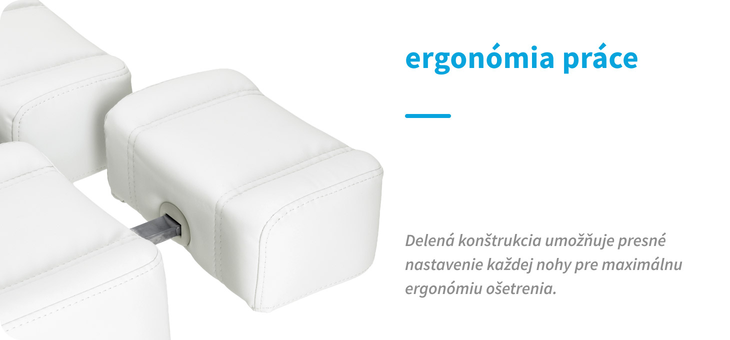 Delená opierka nôh umožňuje nezávislé nastavenie každej nohy, čo uľahčuje presnú a pohodlnú liečbu, a ručné nastavenie uhla sklonu každej časti umožňuje rýchle prispôsobenie polohy potrebám klienta aj osoby vykonávajúcej službu. Možnosť sklopenia stoličky do polohy lehátka výrazne rozširuje jej spektrum použitia. Pri úplnom sklopení dosahuje stolička dĺžku viac ako 2 metre, čím poskytuje pohodlnú a stabilnú oporu tela pre používateľov rôznej výšky, a to aj počas ošetrení vyžadujúcich polohu na chrbte. Tieto parametre robia zariadenie vhodným pre širokú škálu kozmetických a špecializovaných ošetrení, čím zaručujú ergonomickú prácu a vysoký štandard služieb.