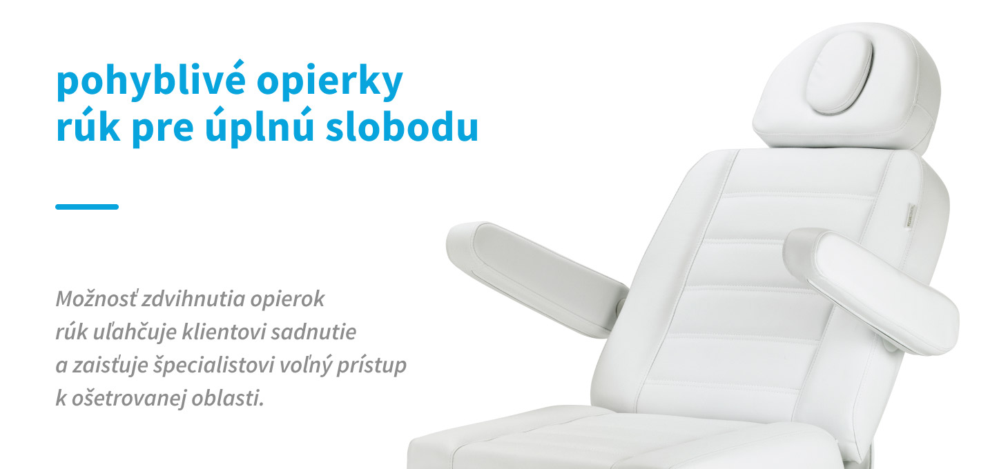 Široké sedadlo zaisťuje vysokú úroveň pohodlia aj počas dlhších procedúr. Pohyblivé podrúčky s funkciou zdvihania uľahčujú klientovi posadenie sa na stoličku a poskytujú ľahký prístup osobe vykonávajúcej procedúru. Stolička je vybavená opierkou hlavy, ktorú je možné predĺžiť o 20 centimetrov, čo zaručuje stabilnú oporu hlavy a dodatočné pohodlie, najmä pre vyšších používateľov. Otvor v opierke hlavy, skrytý pod krytom, zvyšuje pohodlie pri ležaní, najmä počas procedúr vykonávaných na chrbte. Premyslené dizajnové riešenia sa prejavujú v pohodlí zákazníka a ergonomickej práci špecialistu.