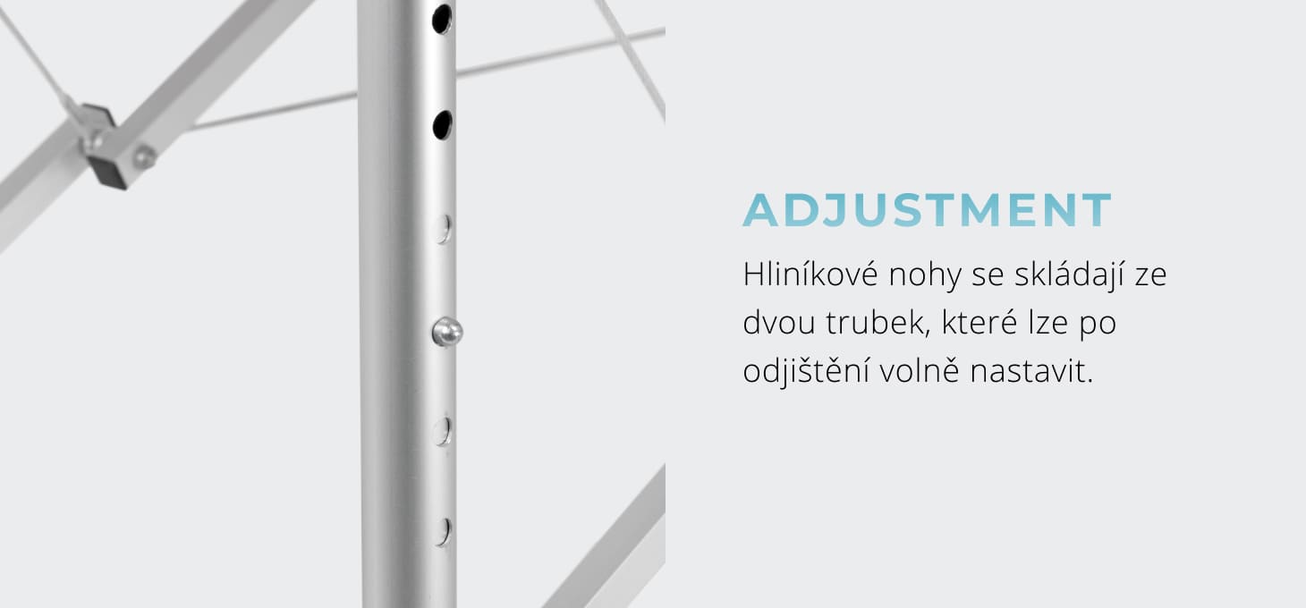 Výšku stoličky možno nastaviť podľa výšky a individuálnych potrieb cvičiaceho pomocou teleskopického nastavenia v rozmedzí 62-80 cm s aretáciou. Každá z hliníkových nohou stolu sa sklápa zo dvoch trubiek, ktoré možno po odemknutí voči sebe volne posúvať. Mechanizmus Fast Lock zaistí kufre v požadovanej polohe po zatvorení zámku. Rámováce konštrukce je navyše stabilizována kovovými lany, vďaka čemuž je masážní stůl robustní a ideální pro širokou škálu služeb.