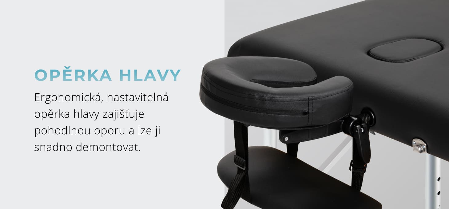 Pre maximálnu pohodlí si osoba používajúca stôl môže oprieť hlavu o ergonomickú opierku hlavy, ktorá je súčasťou dodávky. Tento prvok je ľahko nastaviteľný - umožňuje nastavenie úhlu sklonu vo dvoch rovinách, čo umožňuje presne prispôsobiť jeho nastavenie potrebám užívateľov a charakteru vykonávaných procedúr. Pro terapii vleže na zádech možno opěrku hlavy vyjmout a nahradit ji otorem v desce stolu. Ak sa otvor nepoužíva, možno jej zakrýt dodávanou zátkou, čímž sa obnoví estetický a jednotný vzhled povrchu.