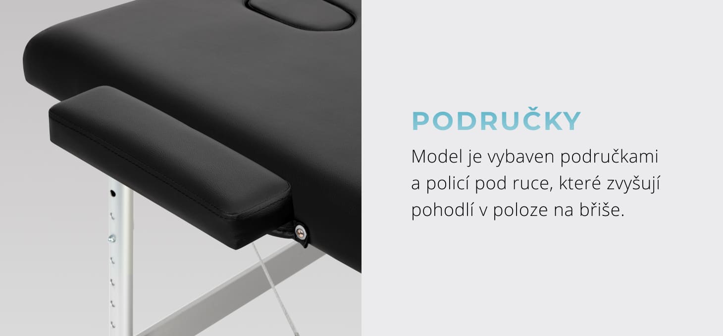 Bez ohľadu na typ vykonávaného ošetrenia alebo polohu, ktorú pacient zaujímá, je zásadná správna poloha paží - zabezpečuje relaxáciu, aniž by bránila terapeutovi v práci. Tento model je vybaven ľahko nasaditelnými područkami a prídavnou políciou na ruce, ktorá je nepostradatelná pri poloze na břiše. Toto riešenie zvyšujú funkčnosť stolu a zaručujú vysokú úroveň pohodlí pre ošetrovanú osobu.