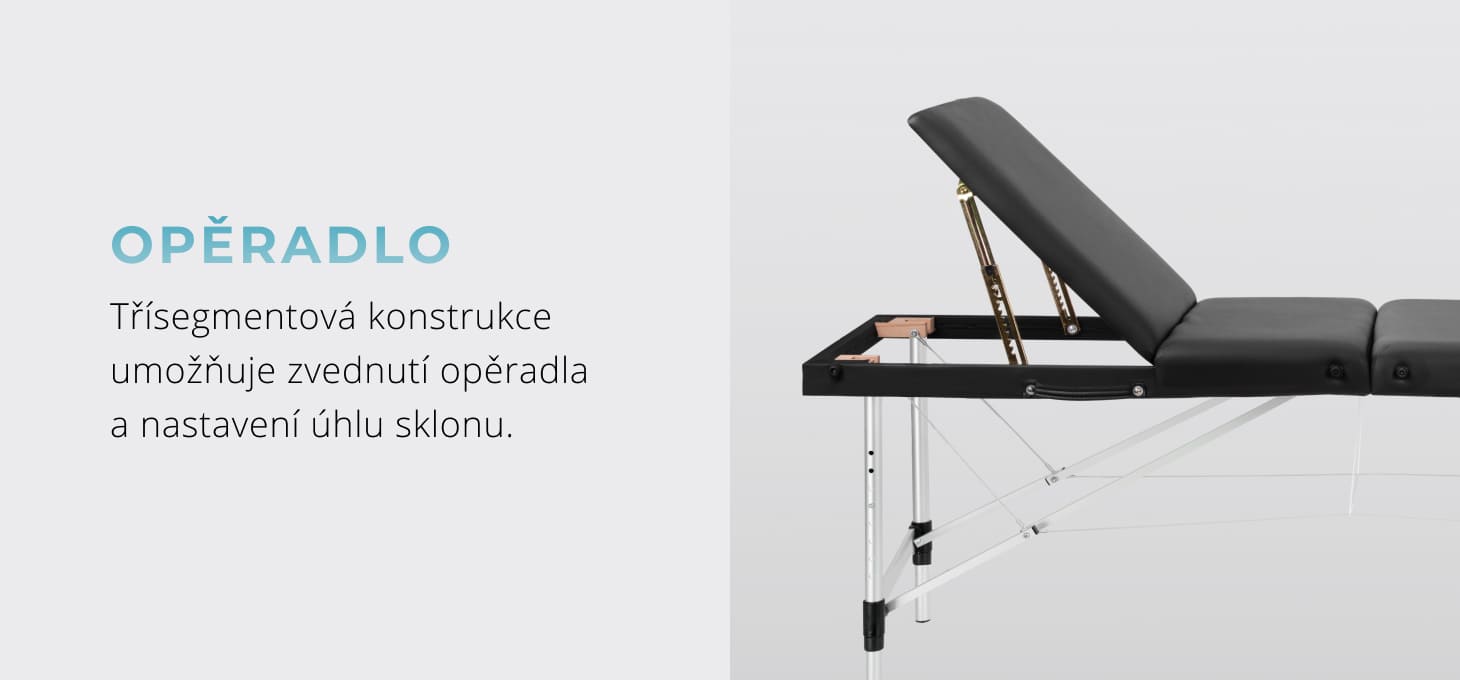 Trojsegmentová konštrukcia stola umožňuje zdvihnutie jedného zo segmentov, ktorý slúži ako operadlo. Nastavenie uhla umožňuje pohodlnú polohu pacienta v polosede alebo v sede, čo je užitočné najmä pri terapiách vyžadujúcich polohovanie, reflexnej terapii alebo kozmetických ošetreniach. Robustný podporný mechanizmus zabezpečuje stabilitu a bezpečnosť, zatiaľ čo nastaviteľnosť zvyšuje funkčnosť stola a umožňuje jeho lepšie prispôsobenie konkrétnym vykonávaným službám.
