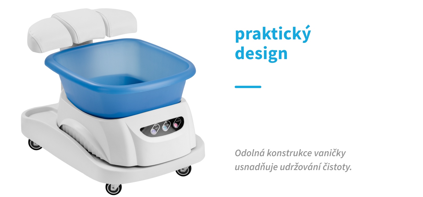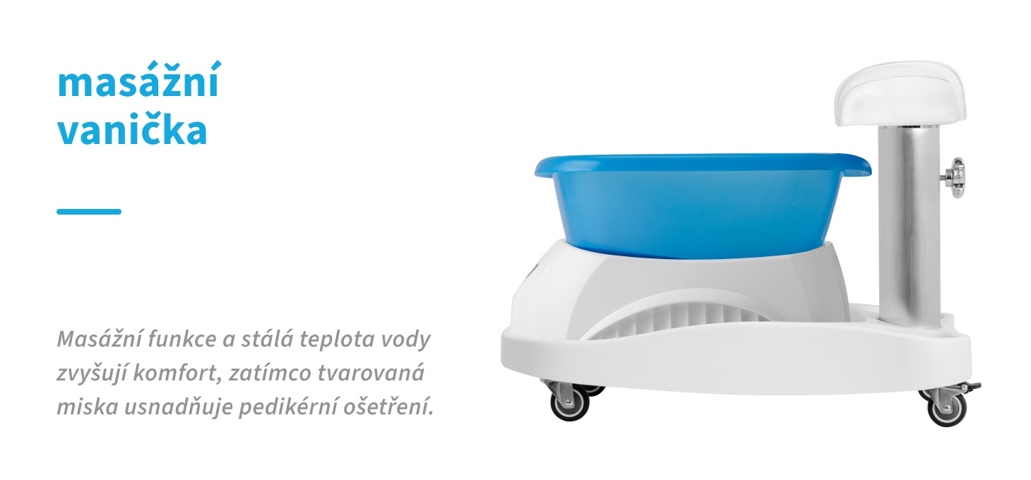 Konštrukcia vaničky zabezpečuje dlhú životnosť pri intenzívnom používaní a uľahčuje udržiavanie čistoty. Model je kompatibilný s pedikérskymi vozíkmi, vďaka čomu je možné jednoducho prispôsobiť pracovisko charakteru ošetrenia a potrebám odborníka.