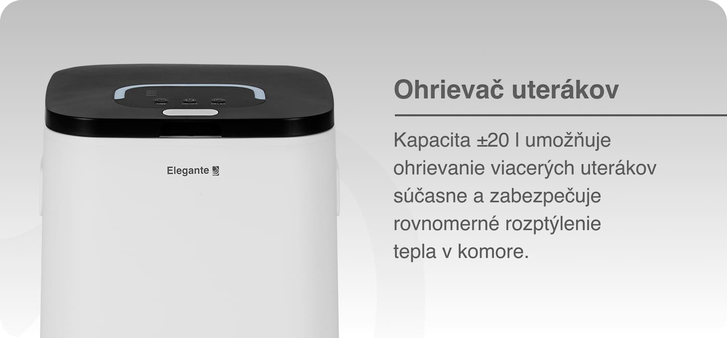 Elegantný ohrievač uterákov Elegante E3 s objemom ± 20 litrov zaručuje, že sa môže súčasne ohrievať niekoľko veľkých uterákov. Konštrukcia v tvare vedra zabezpečuje rovnomerné rozloženie tepla počas každého cyklu. Pre väčšie pohodlie pri používaní je vybavený displejom, držadlami po stranách, háčikmi do interiéru a držiakom na vonný disk.