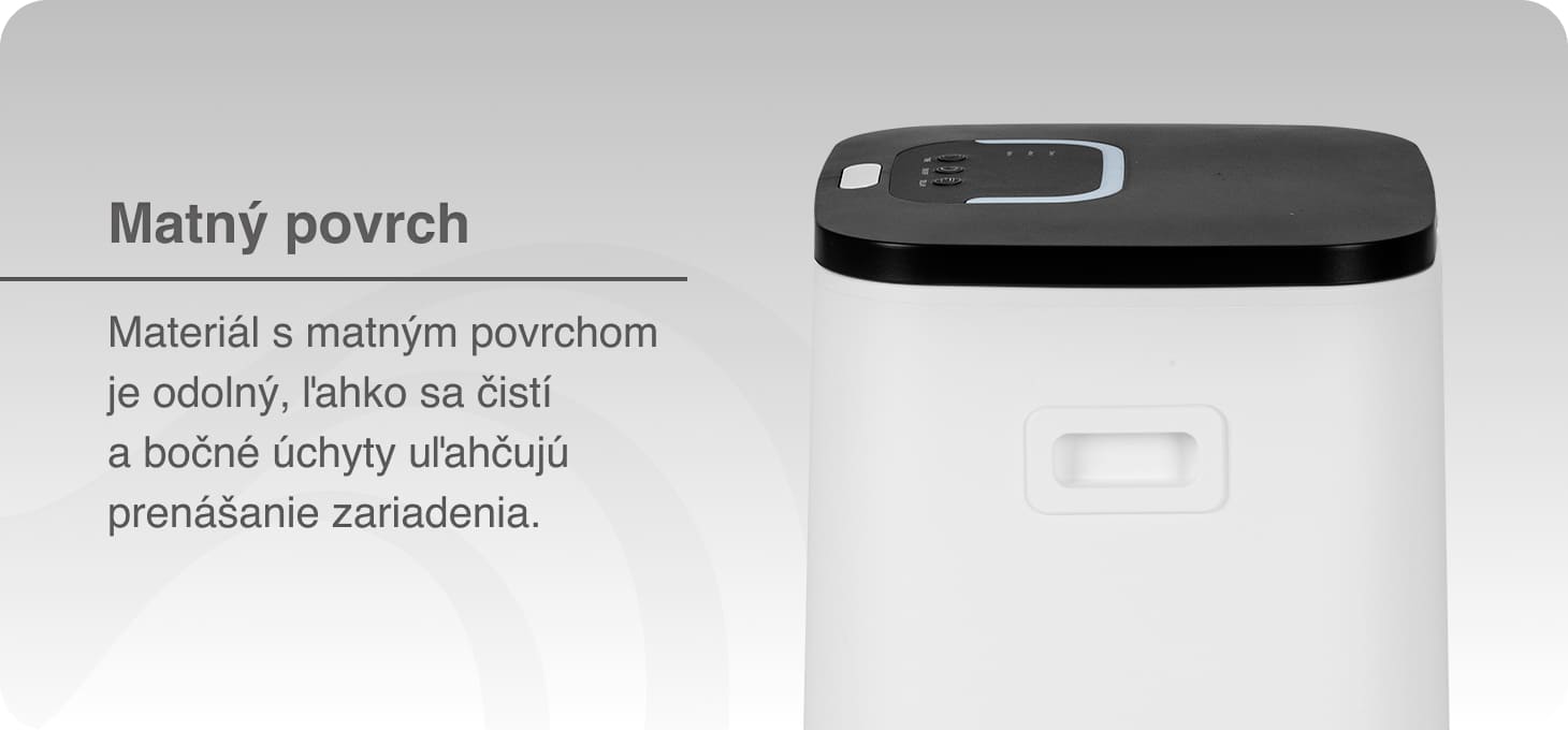 Kryt ohrievača vyrobený z matného bieleho plastu s čiernym vekom je odolný a ľahko sa čistí. Voľne stojaca konštrukcia s držadlami po stranách uľahčuje prenášanie a skladovanie prístroja.
