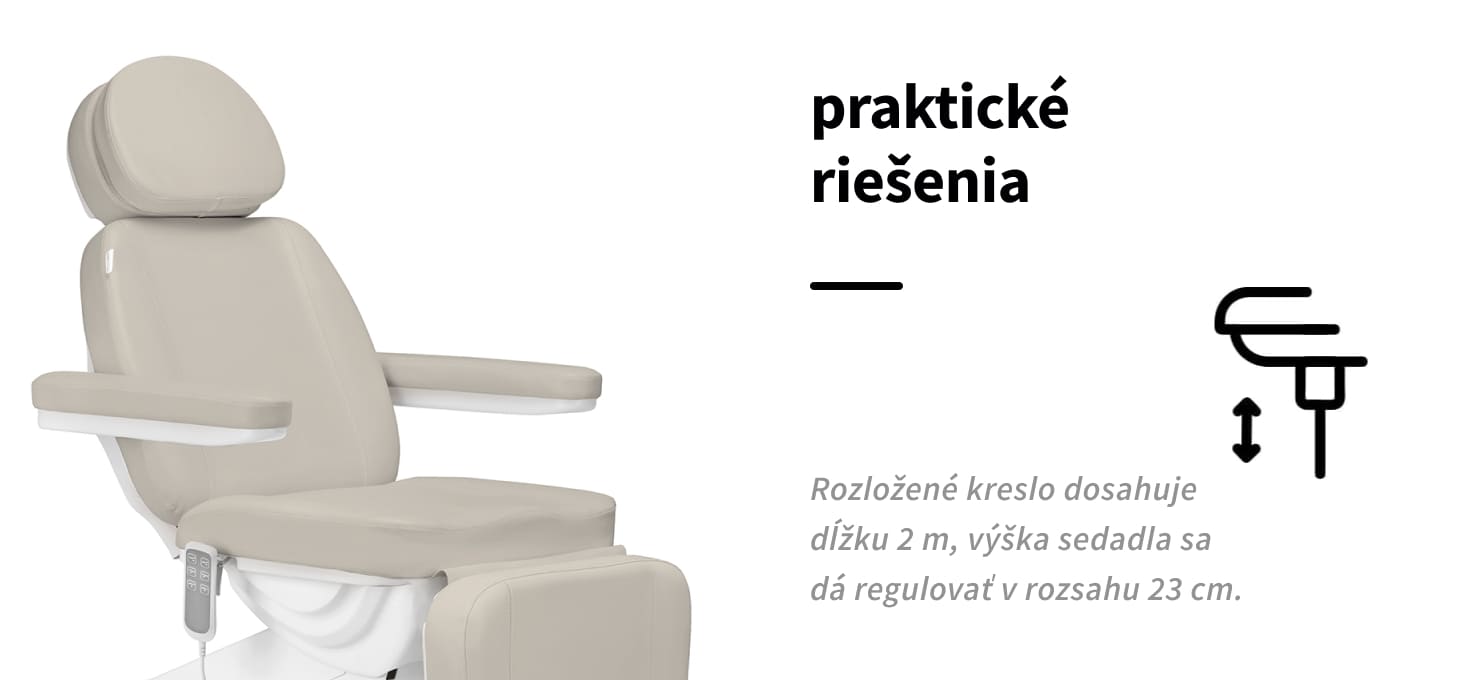 Elektrické kozmetické kreslo Sillon Classic sa vyznačuje jednoduchým vzhľadom, intuitívnym ovládaním a všestrannosťou. Je vybavené 3 pohonmi ovládanými káblovým diaľkovým ovládaním. Vyznačuje sa ergonomicky tvarovaným sedadlom a možnosťou nastavenia podľa individuálnych potrieb, vďaka čomu je ideálne pre mnohé špecializované ordinácie.