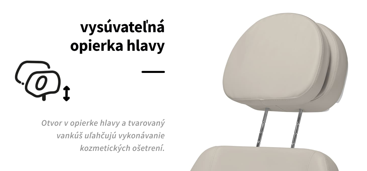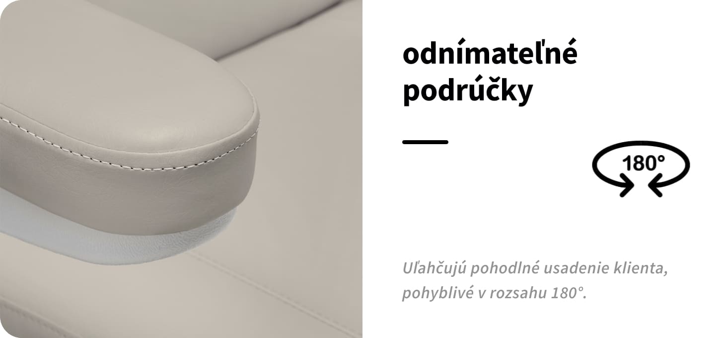 Výsuvná opierka hlavy pomáha prispôsobiť zariadenie používateľom rôznej výšky a poskytuje stabilnú oporu hlavy počas ošetrenia. Je možné nastaviť aj predĺženie opierky nôh, čo bude užitočné najmä pri ošetreniach vyšších osôb, ktorým poskytne lepšiu oporu. Opierky rúk sú pohyblivé o 180°, čo uľahčuje efektívne sedenie a pohodlný prístup pre lekára. V prípade potreby sa dajú ľahko a rýchlo odstrániť.