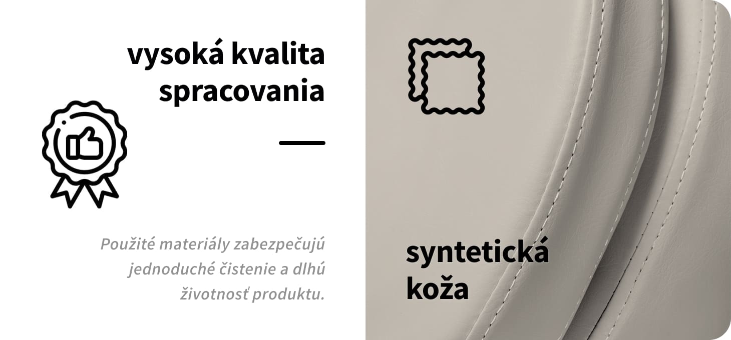 Kreslo je vyplnené tvarovanou penou a potiahnuté syntetickou kožou príjemnou na dotyk v odtieňoch béžovej farby. Vďaka použitému materiálu sa zariadenie ľahko čistí a je odolné voči vlhkosti a vybraným dezinfekčným prostriedkom. Pevná základňa z odolného materiálu v odtieňoch bielej farby zabezpečuje stabilitu počas ošetrovania. Vhodne tvarované lemy dodávajú kreslu štýlový vzhľad a umožňujú ergonomické sedenie. Minimalistický, jednoduchý dizajn a klasické farby umožňujú, aby sa hodila do každého interiéru.