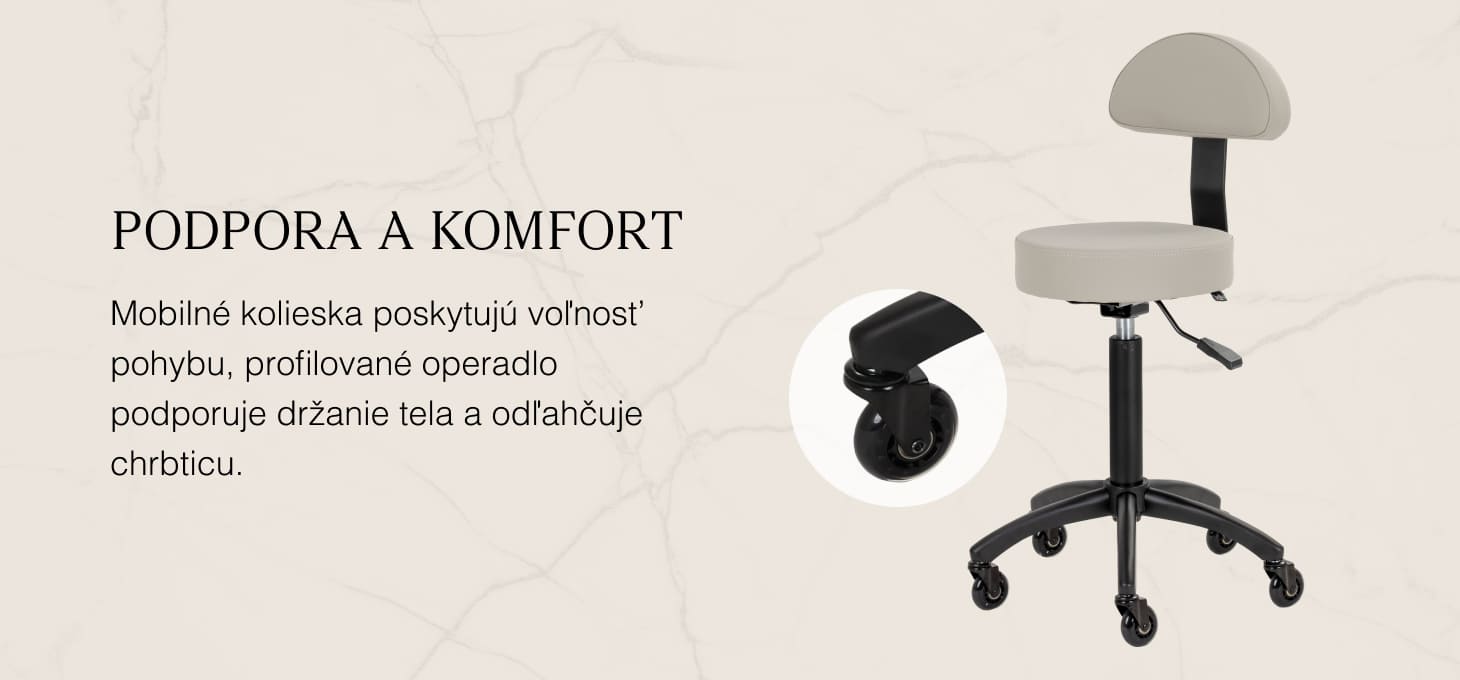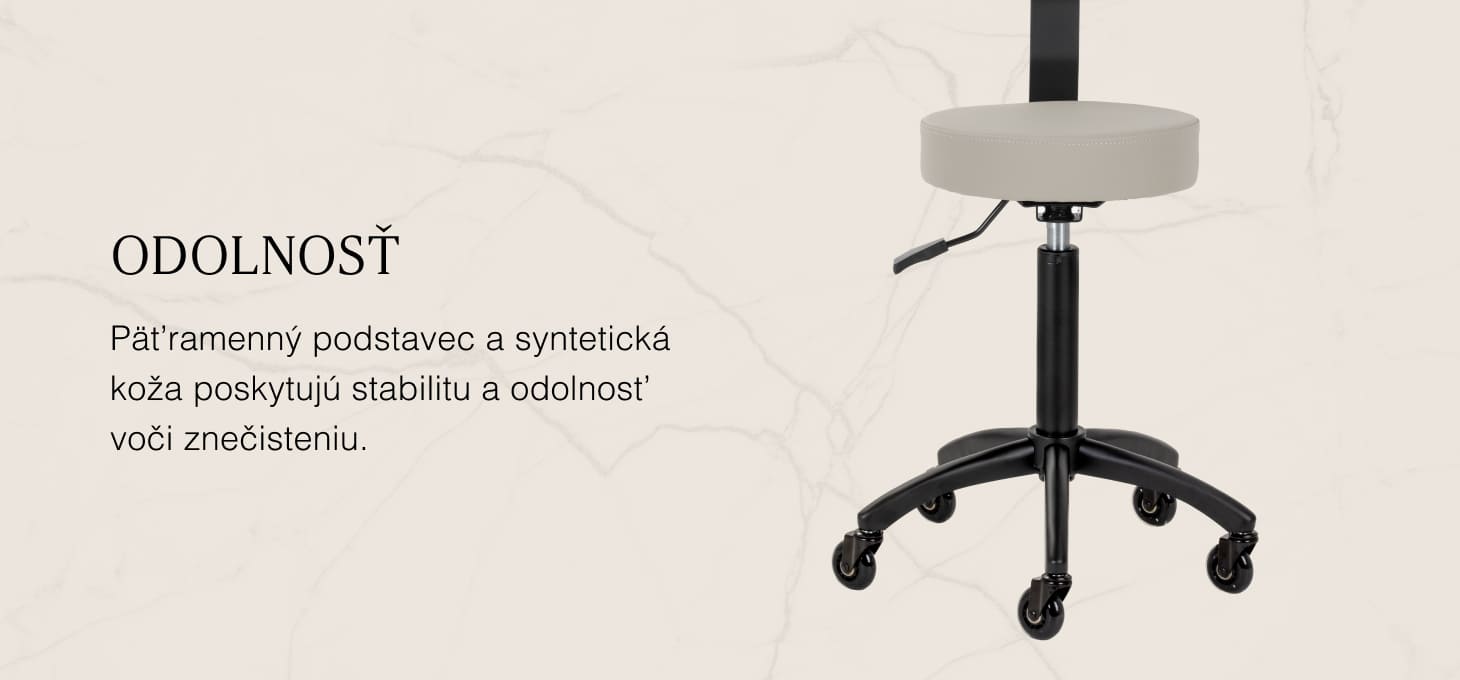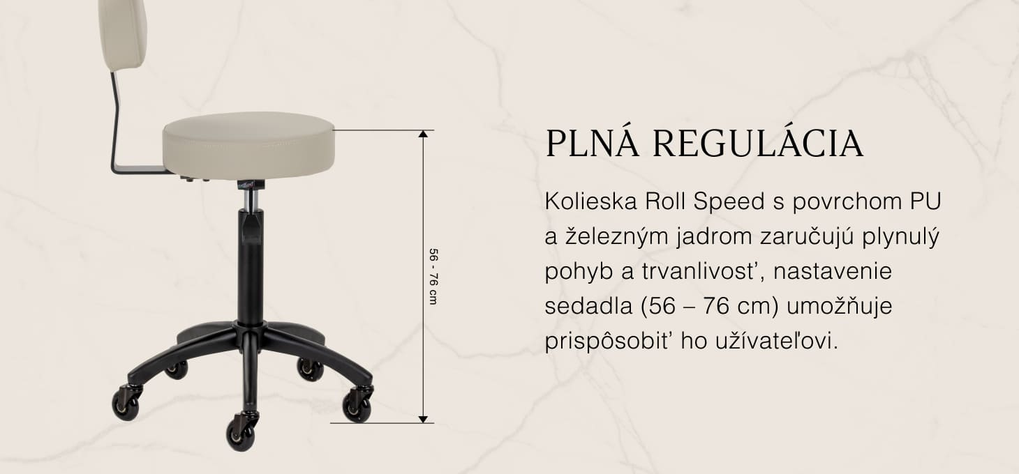 Nastavenie výšky sedadla je v rozsahu od 56 do 76 cm, čo umožňuje prispôsobiť polohu individuálnym potrebám profesionála pri vykonávaní služieb. Opierka chrbta podporuje chrbticu a zabezpečuje pohodlie aj počas dlhodobej práce. Mechanizmus úplného otáčania zvyšuje voľnosť pohybu, čo vedie k väčšiemu pohodliu a efektivite. Mobilitu zabezpečujú kolieska Roll Speed so železným jadrom a polyuretánovým (PU) poťahom, ktoré kombinujú plynulý pohyb s výnimočnou odolnosťou proti opotrebovaniu. Použitie ložísk ABEC-7 uľahčuje pohyb stoličky, výrazne uľahčuje manévrovanie.