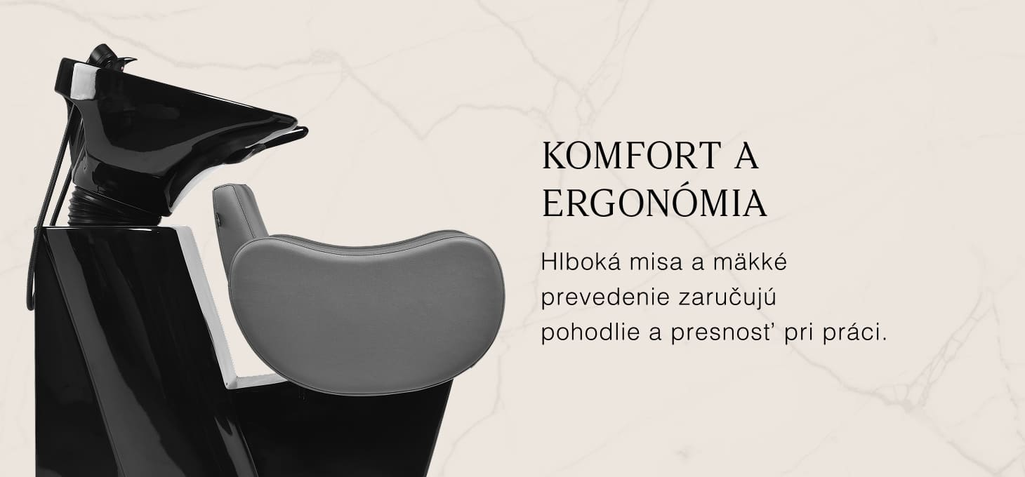 Hlboká keramická miska v odtieňoch čiernej farby znižuje rozstrekovanie vody a produktov používaných počas ošetrenia. Nastaviteľný sklon misy umožňuje prispôsobenie individuálnym potrebám a vďaka použitému materiálu je umývadlo odolné, odolné voči škvrnám a poškriabaniu a ľahko sa udržiava v čistote. Ergonomicky profilovaný golier poskytuje pohodlnú oporu hlavy, zatiaľ čo mäkký čierny plastový kryt eliminuje pocit chladu z keramického povrchu.