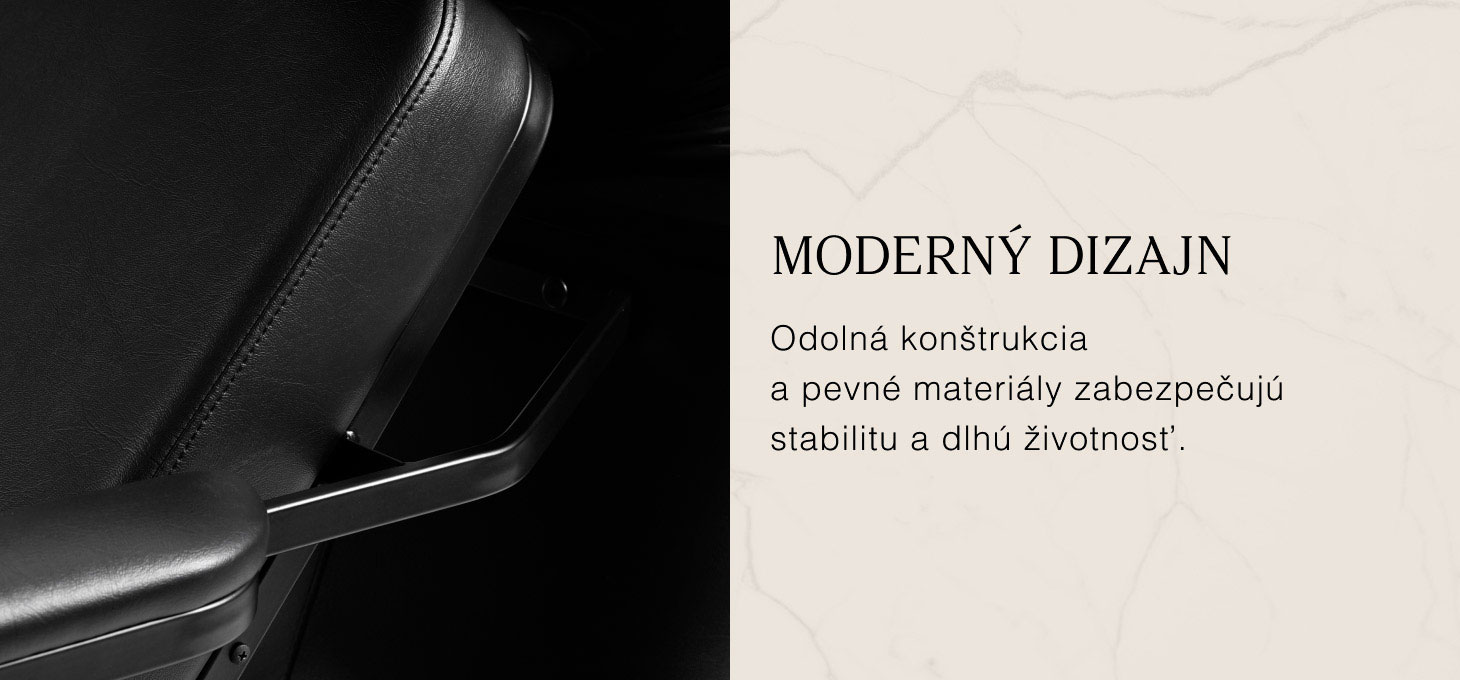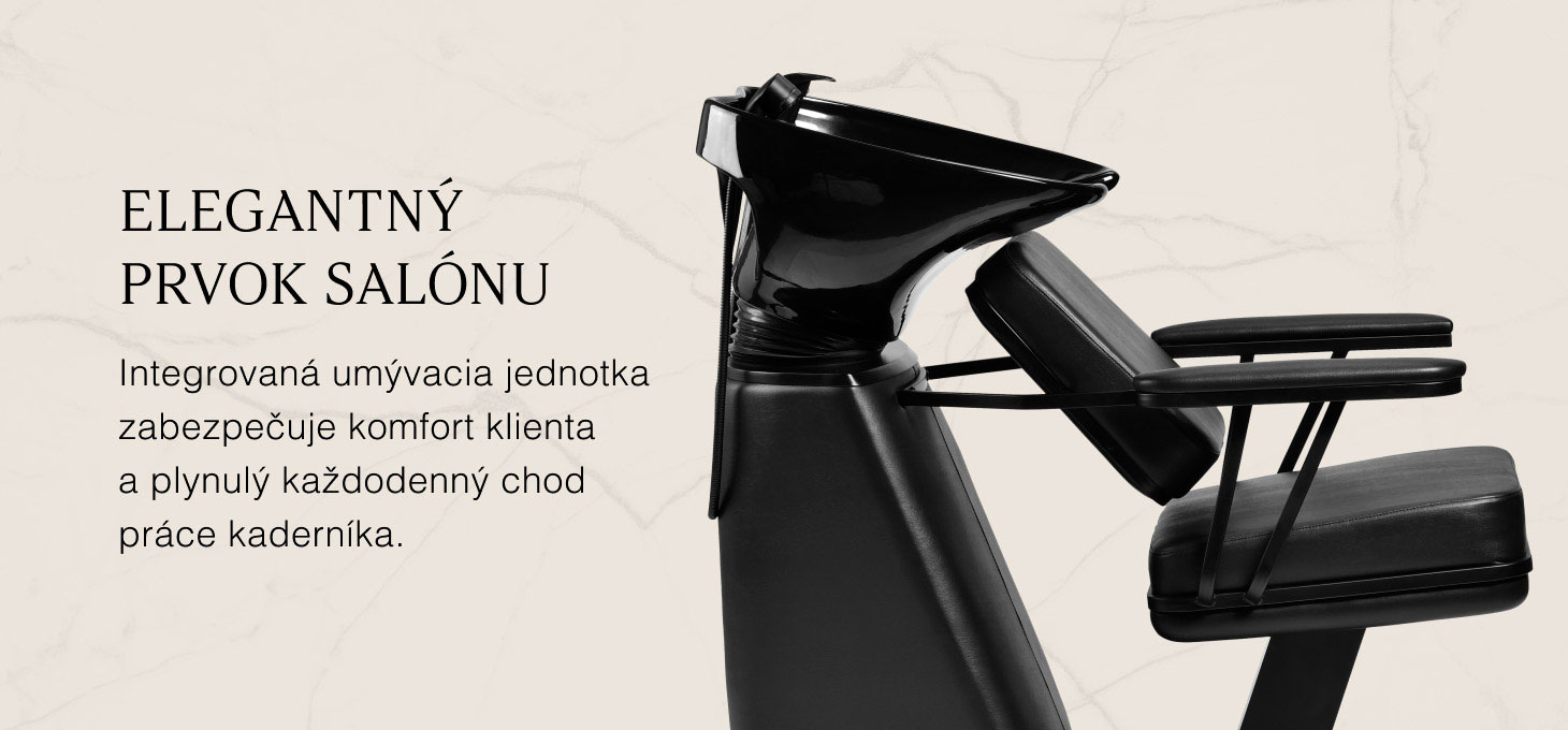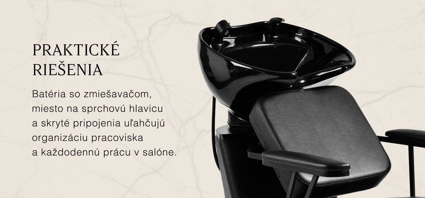 Tvarovaná stolička poskytuje oporu bedrovej chrbtice a vysoký komfort používania, zatiaľ čo čalúnené podrúčky umožňujú správne polohovanie ramien zákazníka. Odolná pena odolná voči deformácii v kombinácii s príjemnou na dotyk čiernou syntetickou kožou zaručuje komfort, odolnosť a ľahké čistenie po dlhú dobu. Moderný vzhľad umývacieho stanovišťa dodáva interiéru jedinečný charakter a kompletné čierne príslušenstvo – batéria, sprchová hlavica a špeciálne hadice – poskytujú sadu nástrojov pripravenú na okamžité použitie.