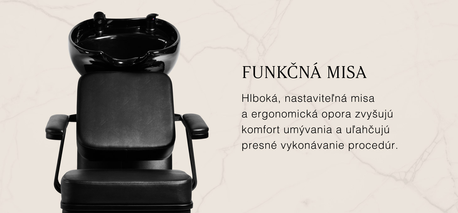 Čierna keramická misa, navrhnutá s ohľadom na pohodlie kaderníka a zákazníka, umožňuje efektívne vykonávanie širokej škály kaderníckych služieb a jej vhodná hĺbka znižuje rozstrekovanie vody a produktov používaných počas ošetrení. Nastaviteľný uhol umožňuje prispôsobiť nastavenie individuálnym potrebám a vysoká kvalita materiálov zaručuje odolnosť, odolnosť voči sfarbeniu a poškriabaniu a ľahké čistenie. Tvarovaný golier a sklonené operadlo zaručujú pohodlnú oporu pri umývaní vlasov, zatiaľ čo pohodlný čierny plastový kryt eliminuje nepríjemný pocit chladu z keramického povrchu.