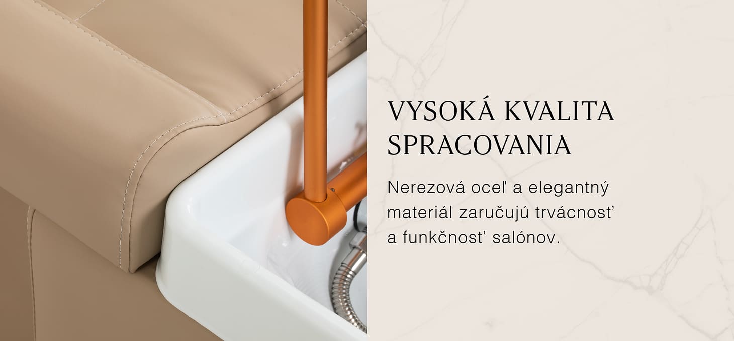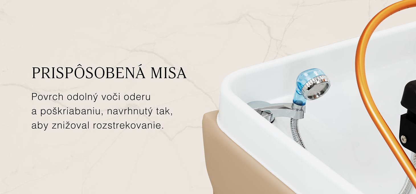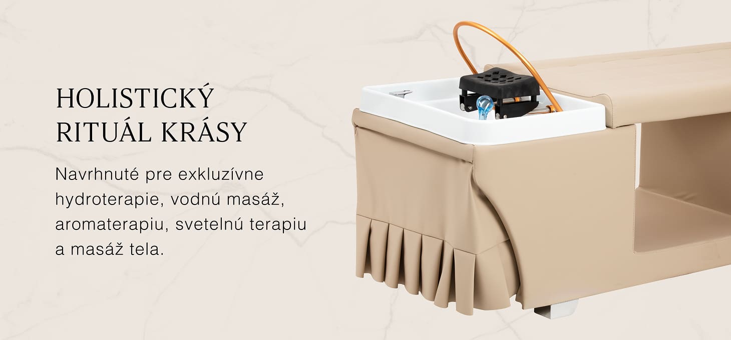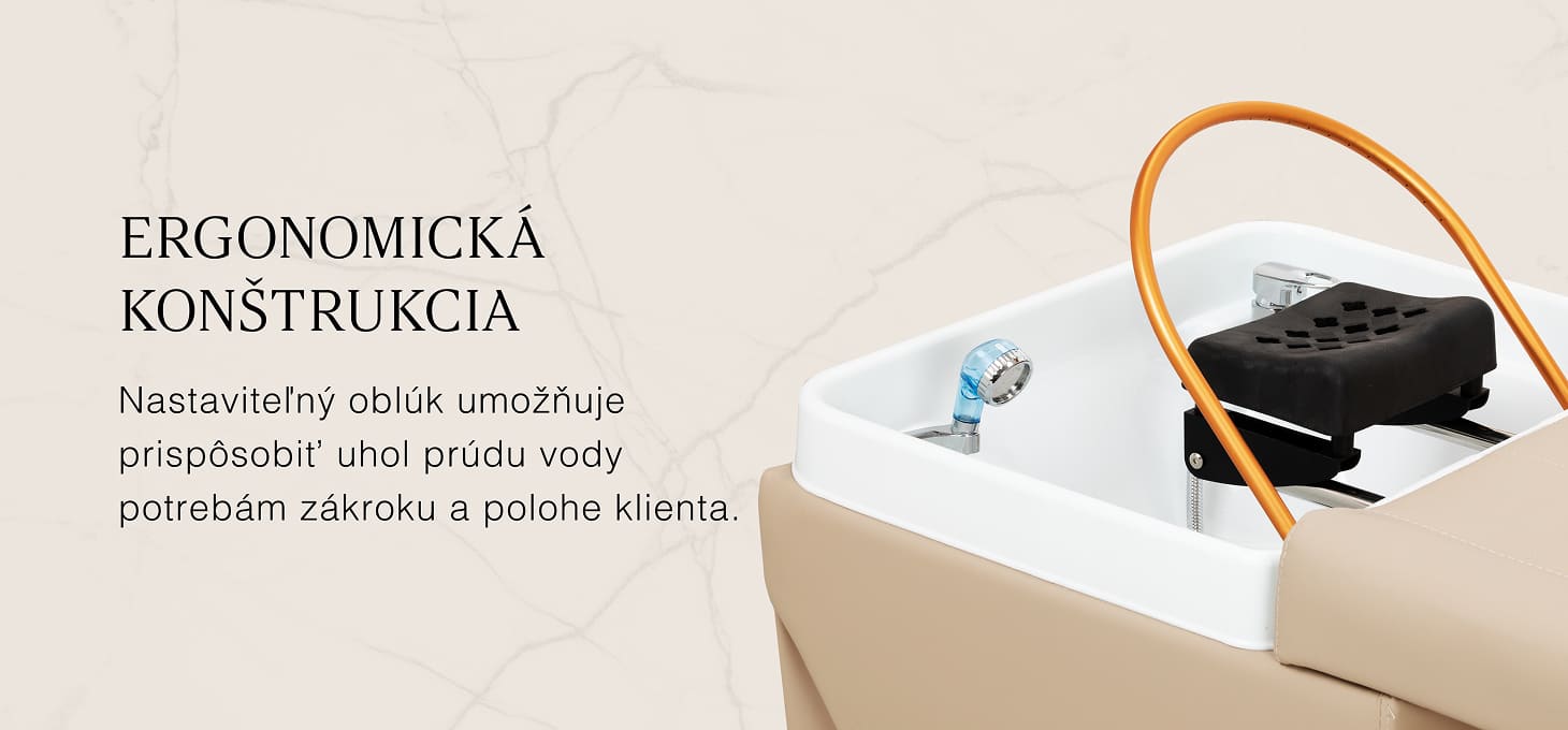 Umývacia jednotka je vybavená zmiešavacou batériou, ktorá umožňuje presné nastavenie teploty vody podľa potrieb klienta. Vyhradený priestor pre sprchovú hlavicu zvyšuje účinnosť, zatiaľ čo pochrómovaná zátka so špeciálnym sitkom zabezpečuje reguláciu prietoku vody a udržiava vysokú úroveň hygieny. Vodovodná prípojka je umiestnená vo vnútri podstavca, za textíliou, čo esteticky zakrýva vodovodné potrubie a dodáva celému zariadeniu elegantný vzhľad. Ergonomicky tvarované lôžko zaisťuje pohodlie počas rôznych kozmetických procedúr. Jednotku dopĺňa praktický puf, ktorý zvyšuje pohodlie personálu a zvyšuje funkčnosť jednotky. Vďaka týmto vlastnostiam je umývacia jednotka ideálna pre kadernícke aj SPA salóny.