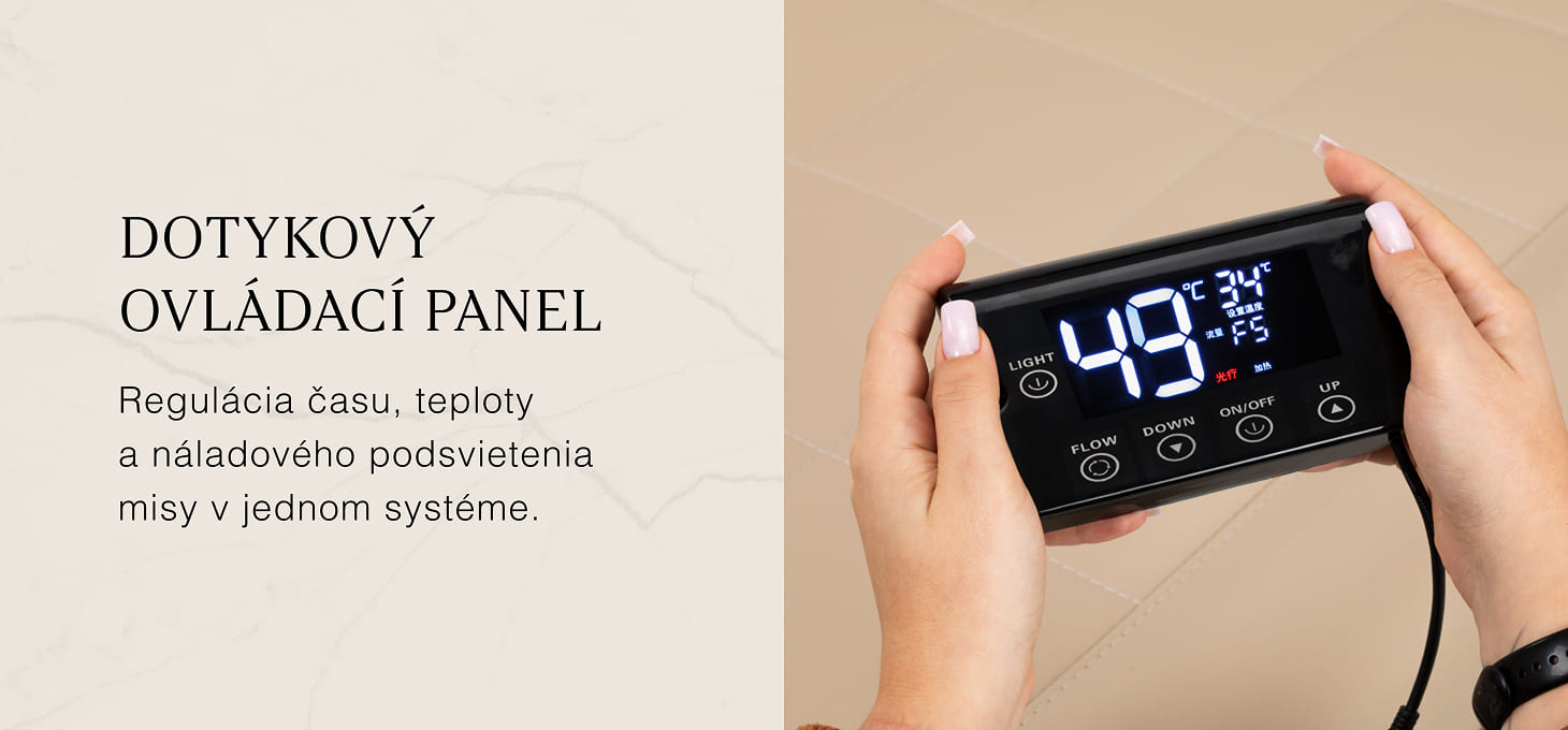 Intuitívny dotykový panel umožňuje úplnú kontrolu nad parametrami ošetrenia a jednoduché používanie. Umožňuje nastaviť čas prevádzky a teplotu vody, ako aj sledovať ich aktuálne hodnoty na prehľadnom a ľahko čitateľnom displeji. Okrem toho panel umožňuje aktivovať funkciu svetelnej terapie, ktorá osvetľuje misu a vytvára atmosféru uvoľnenia a luxusu. Súčasťou súpravy je aj diaľkový ovládač, ktorý vám umožní pohodlne ovládať zariadenie na parnú terapiu na diaľku.