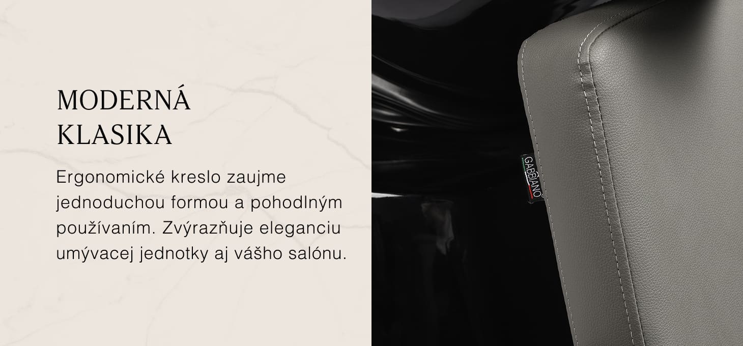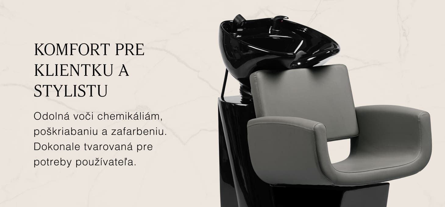 Táto minimalistická stolička s výrazne zaobleným sedadlom spája jednoduchú formu s vysokým komfortom. Operadlo s optimálnym uhlom sklonu podporuje prirodzenú polohu tela. Čalúnenie z vysokokvalitnej syntetickej kože v odtieňoch sivej farby je odolné a ľahko sa čistí. Moderný dizajn nábytku podčiarkuje elegantný charakter umývacej jednotky a dokonale dopĺňa zariadenie salónu. Súčasťou súpravy je kompletná súprava príslušenstva s matnou povrchovou úpravou v odtieňoch čiernej farby vrátane batérie, sprchovej hlavice a príslušných hadíc, ktorá poskytuje kompletnú sadu pracovných nástrojov.