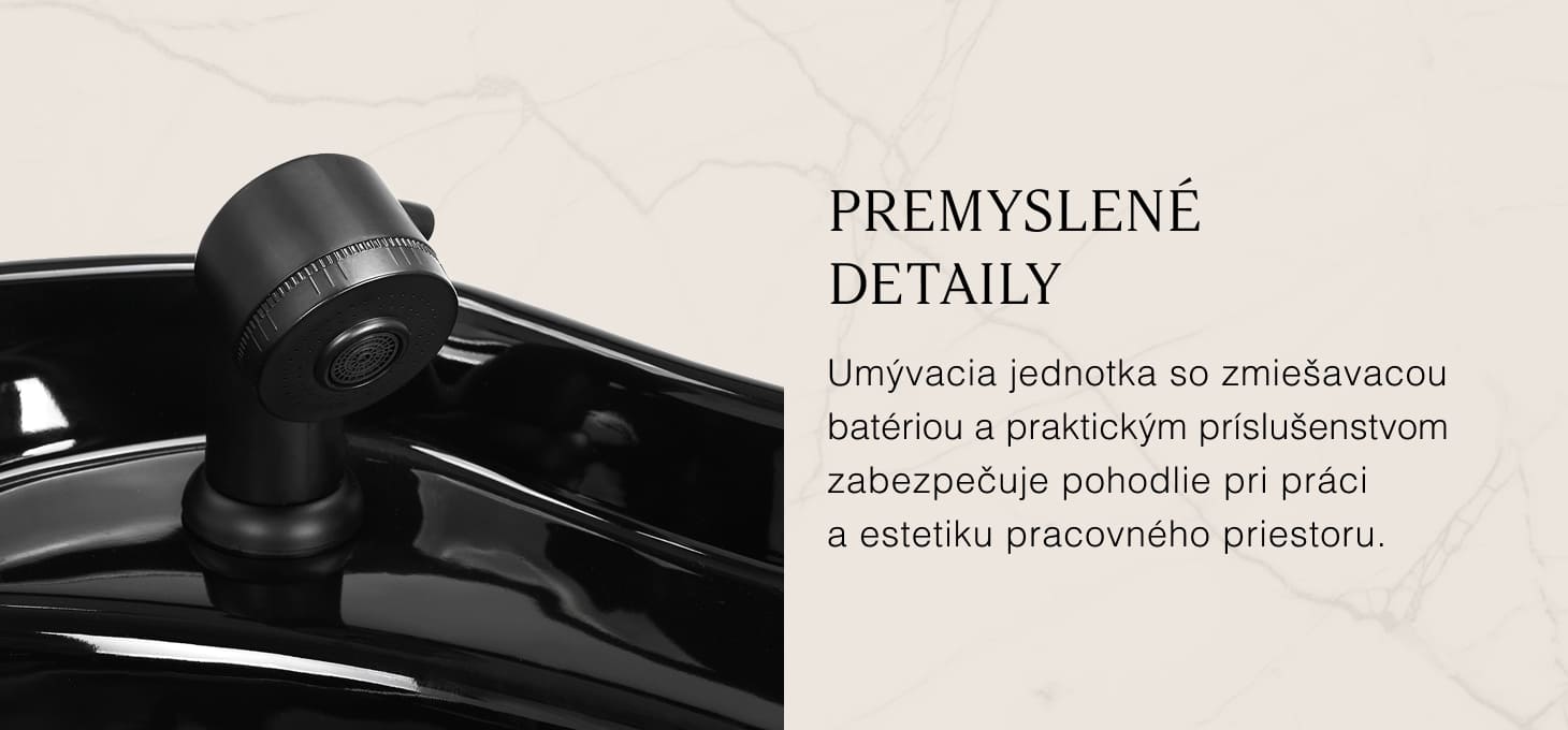 Umývacia jednotka je vybavená zmiešavacou batériou, ktorá poskytuje stály prístup k teplej a studenej vode a umožňuje jednoduché nastavenie teploty podľa potrieb klienta. Praktické miesto na umiestnenie sprchovej hlavice pomáha udržiavať poriadok na pracovisku, zatiaľ čo zátka so špeciálnym sitkom uľahčuje kontrolu prietoku vody a udržiavanie hygieny. Vodovodná prípojka je umiestnená vo vnútri podstavca, čo esteticky skrýva vodovodné potrubie. Minimalistické kreslo je navrhnuté s ohľadom na pohodlie klienta aj kaderníka. Kombinácia funkčných riešení a ergonomických detailov zabezpečuje plynulú a pohodlnú každodennú prácu.