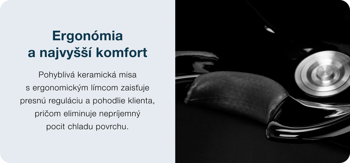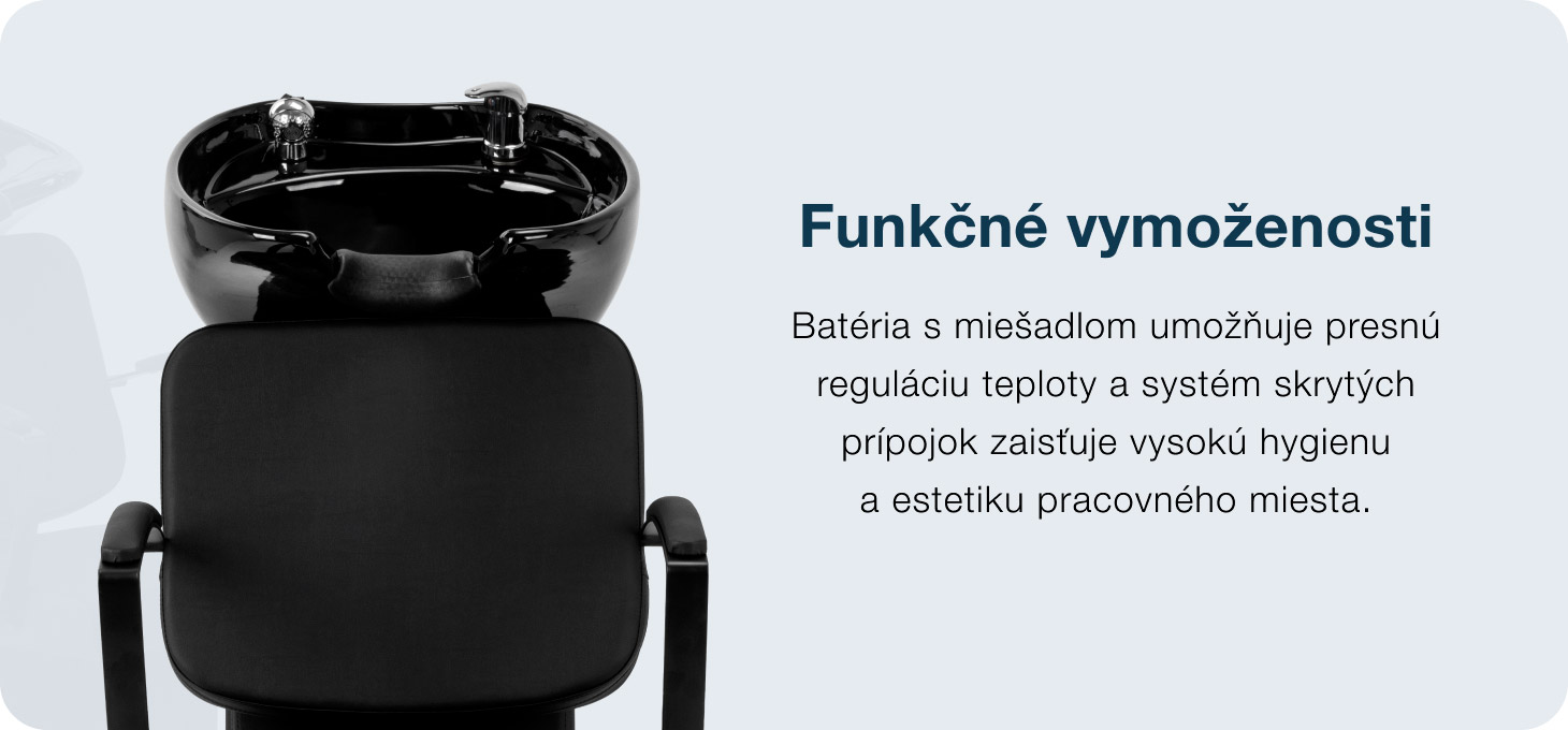 Umývacia jednotka je vybavená batériou, ktorá zabezpečuje neustály prístup k teplej a studenej vode a možnosť presného nastavenia teploty podľa potrieb a preferencií zákazníka. Praktické miesto na odloženie sprchovej hlavice zlepšuje každodennú prácu a zátka s vstavaným sitkom umožňuje regulovať prietok vody a pomáha udržiavať vysokú úroveň hygieny v salóne. Vodné pripojenie umiestnené vo vnútri základne umožňuje estetické skrytie inštalácie. Kontúrovaná stolička zaručuje pohodlie pri rôznych procedúrach a kombinácia funkčných riešení a praktických doplnkov sa prejavuje ešte väčším komfortom pri práci v kaderníckom salóne.
