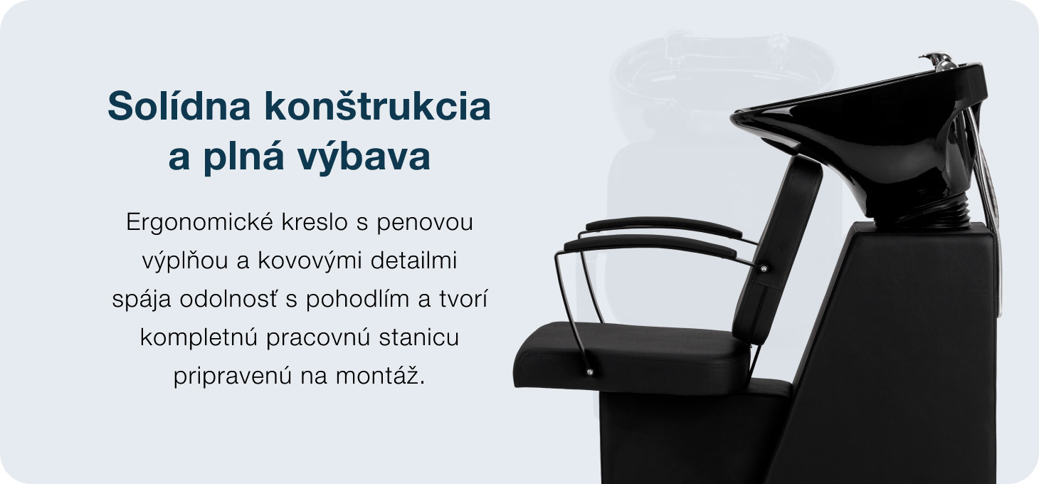 Ergonomicky tvarovaná stolička s odolnou penovou výplňou zaisťuje vysoký komfort používania. Jemne zakrivené, čiastočne čalúnené podrúčky umožňujú správne polohovanie ramien a sú atraktívnym vizuálnym prvkom. Pohodlné operadlo zaručuje stabilnú oporu chrbta a správnu polohu počas procedúry. Čierne čalúnenie v kombinácii s dekoratívnymi kovovými prvkami dodáva celku nadčasový, elegantný charakter. Použité materiály sa vyznačujú odolnosťou a ľahkou údržbou. Originálne tvarovanie umývacieho zariadenia dodáva interiéru jedinečný charakter. Sada obsahuje kompletné príslušenstvo, vrátane batérie, sprchovej hlavice a špeciálnych hadíc, čím je zaručená plná pripravenosť na použitie.