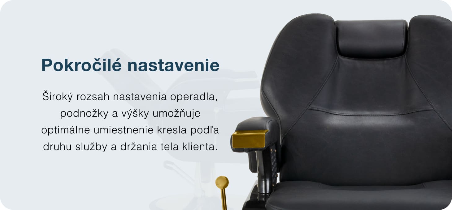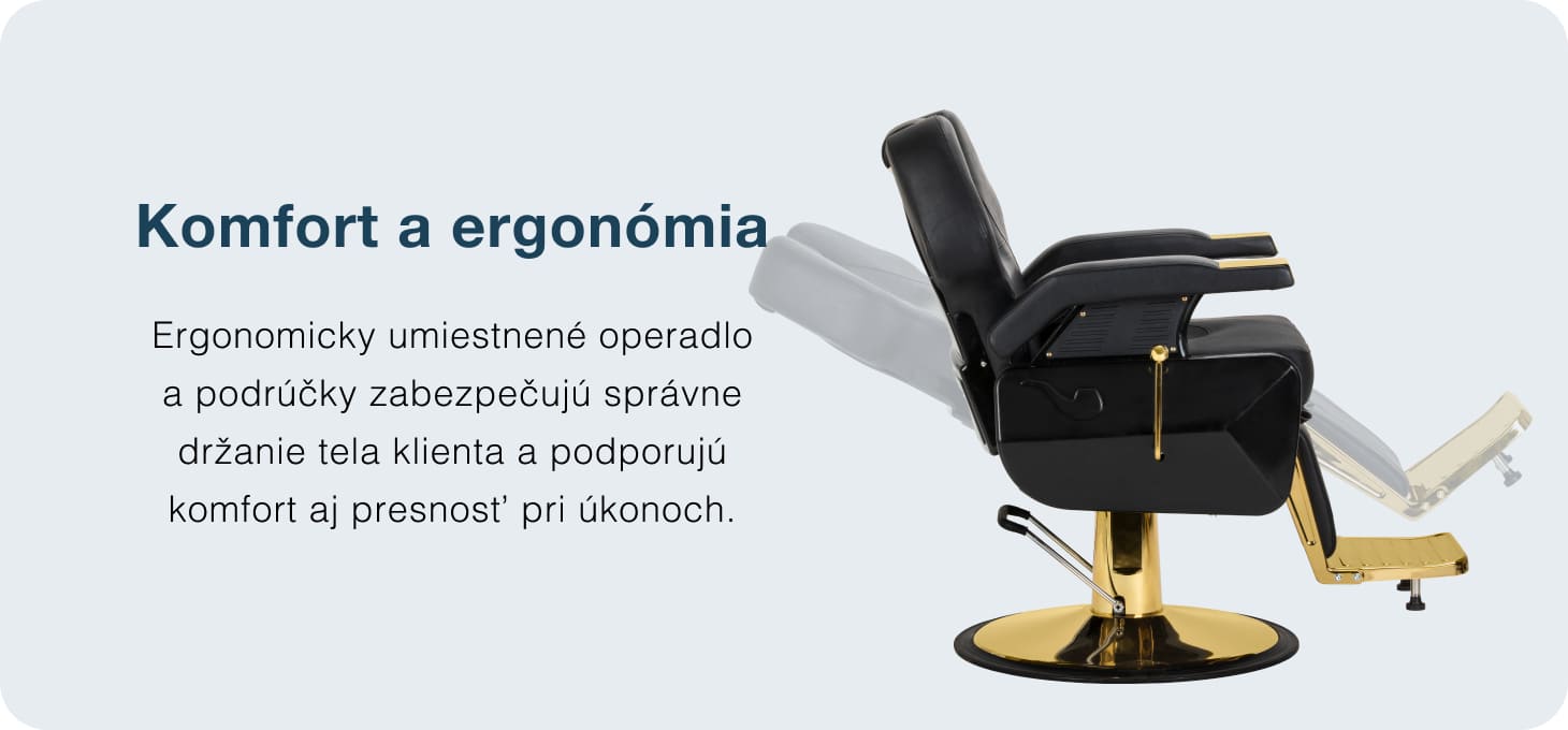 Pohodlné sedadlo zabezpečuje pohodlie klienta počas rôznych služieb. Ergonomická opierka chrbta poskytuje vynikajúcu oporu chrbta a umožňuje pohodlnú polohu, čo je dôležité najmä pri dlhších ošetreniach. Plne otočný mechanizmus zvyšuje voľnosť pohybu a zlepšuje prácu kaderníka. Čalúnené podrúčky umiestnené v správnej výške pomáhajú správne polohovať ramená klienta, zabraňujú hrbeniu a uľahčujú presné strihanie.