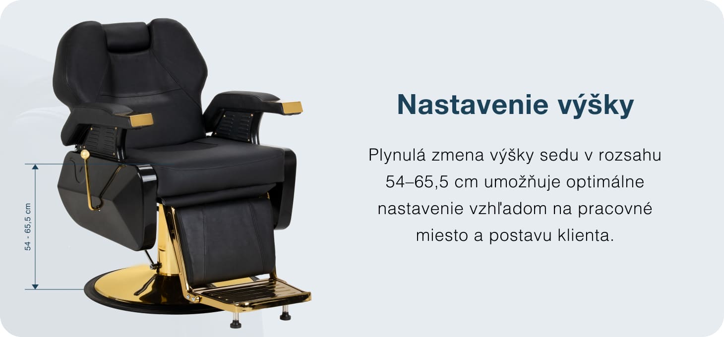 Stabilná kruhová základňa v zlatej povrchovej úprave dodáva kreslu výrazný vzhľad a zaručuje stabilitu pri práci. Sedadlo, operadlo a opierka na nohy sú vyplnené penou odolnou proti deformáciám a čalúnené čiernou syntetickou kožou príjemnou na dotyk, ktorá zaručuje odolnosť a vysoký komfort. Vďaka povrchu odolnému voči vlhkosti a ľahkej údržbe je stolička ideálna na každodenné používanie. Zlaté detaily a výrazné línie čalúnenia zdôrazňujú exkluzívny charakter nábytku a dodávajú mu moderný, mierne automobilový štýl. Elegantný dizajn sa dokonale hodí do interiéru holičstiev.