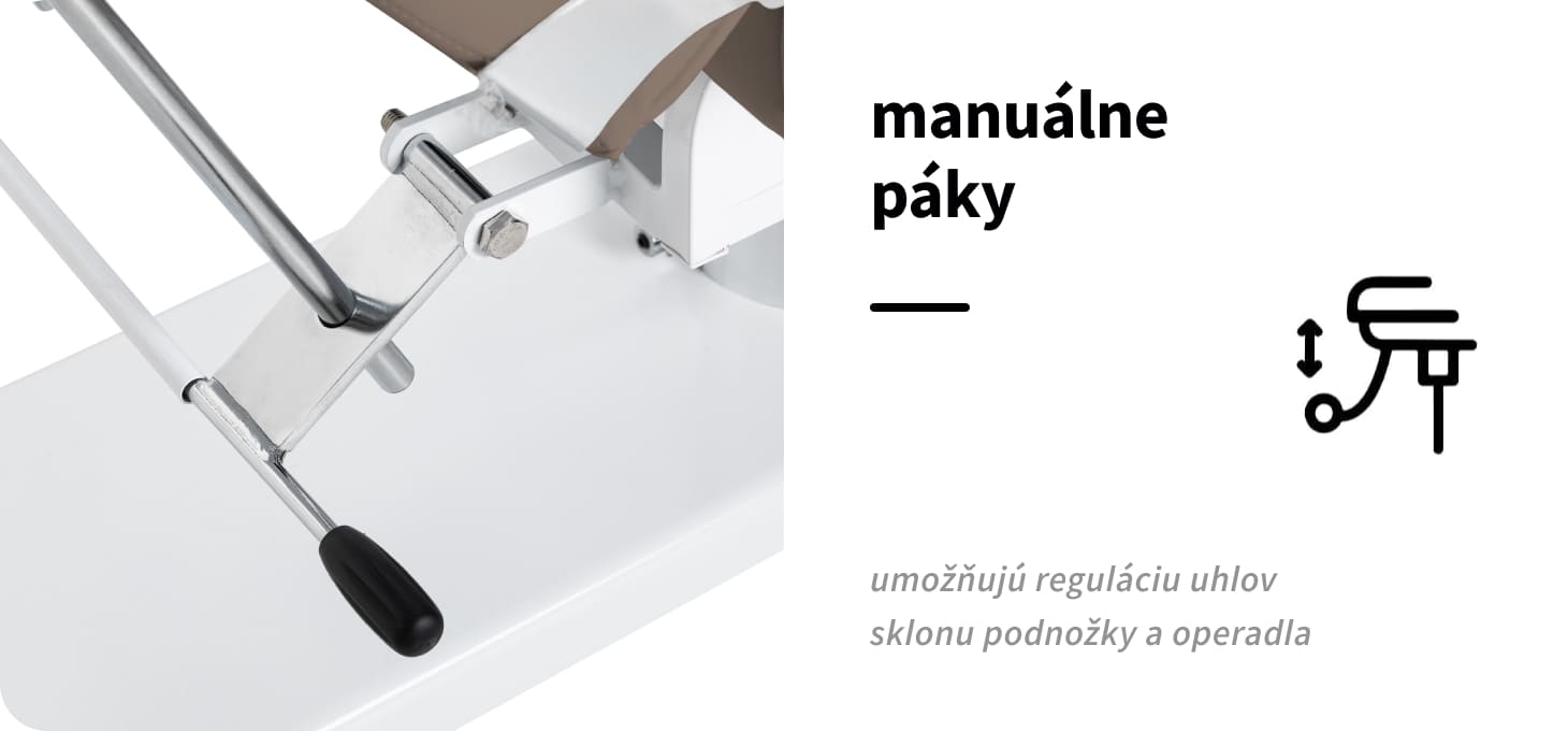 Pomocou špeciálnych pák je možné plynulo nastaviť uhly, v ktorých sú umiestnené opierka nôh a operadlo. To umožňuje optimálne prispôsobiť nastavenia individuálnym potrebám pre správne a pohodlné ošetrenie a pohodlie. Kreslo možno vysunúť až do polohy ležadla, čo výrazne zvyšuje jeho funkčnosť pri ošetrení tváre aj tela.
