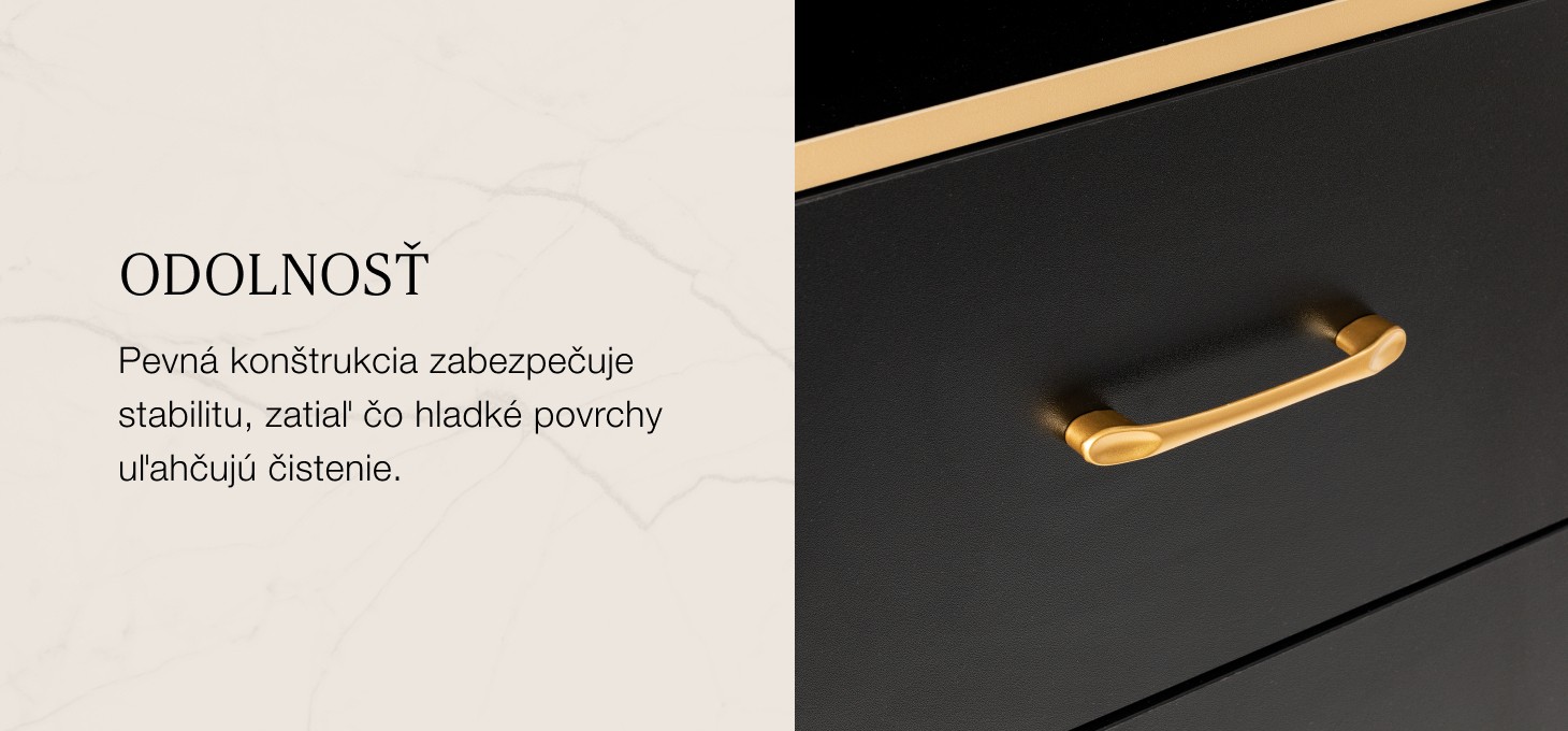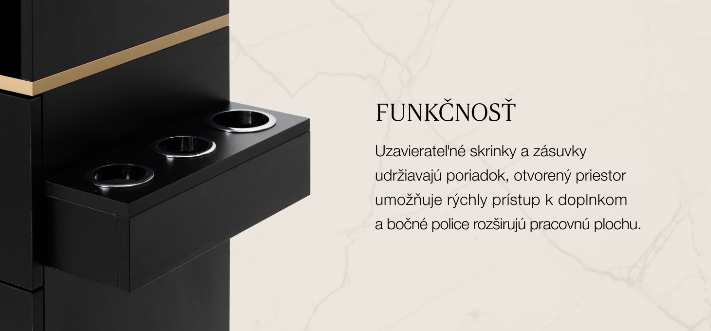 Pevná konštrukcia zaručuje stabilitu a hladké povrchy uľahčujú udržiavanie nábytku v čistote. Klasická farebná kombinácia dodáva skrinke nadčasový charakter, ktorý sa skvele hodí tak k minimalistickým, ako aj výraznejším interiérom. Zlaté úchytky nielenže podčiarkujú elegantný dizajn, ale tiež zabezpečujú pohodlné otváranie každej skrinky a zásuvky. Celok predstavuje praktické riešenie pre kadernícky salón, kde je dôležitý poriadok, ergonómia práce a jednotná estetika pracoviska.