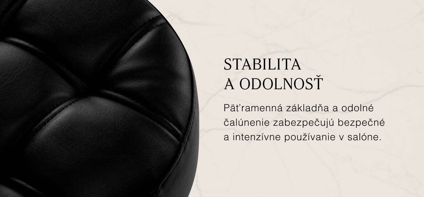 Päťramenná základňa zaisťuje stabilitu a bezpečnosť používania aj pri častých zmenách polohy. Pogumované kolieska umožňujú voľný pohyb po miestnosti. Odolné čalúnenie z umelej kože v odtieňoch čiernej farby je odolné a ľahko sa udržiava v čistote. Dekoratívne prešívanie dodáva eleganciu a zdôrazňuje profesionálny charakter stoličky.