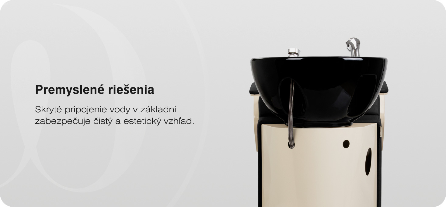 Model je vybavený batériou s miešačom, ktorá zabezpečuje neustály prístup k teplej a studenej vode a pohodlné prispôsobenie teploty potrebám klienta. Miesto na odloženie sprchovej hlavice zefektívňuje organizáciu pracoviska a zátka so zabudovaným sitkom umožňuje kontrolu prietoku vody a podporuje udržiavanie hygieny pracoviska. Vodné pripojenie skryté vo vnútri podstavca umožňuje estetické zakrytie inštalácie, čím zdôrazňuje upravený a profesionálny vzhľad umývacieho kútika. Funkčné riešenia sa prejavujú v efektívnej a usporiadanej každodennej práci v salóne.