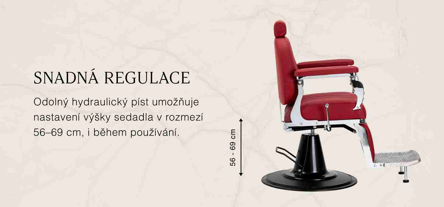 Odolný hydraulický zdvih umožňuje jednoduché nastavenie výšky sedadla v rozmedzí 56-96 cm, a to aj keď zákazník sedí na stoličke. To zaručuje ergonomickú prácu a jednoduché nastavenie výšky sedadla podľa výšky zákazníka a osoby, ktorá vykonáva ošetrenie. Model je vybavený sklopným operadlom a nastaviteľnou opierkou nôh, čo umožňuje umiestniť zákazníka do pohodlnej polohy s polosklopeným operadlom a poskytuje lepší prístup počas vybraných služieb. Okrem toho opierka hlavy, ktorú je možné predĺžiť o 20 cm, zaručuje stabilnú a pohodlnú oporu hlavy prispôsobenú individuálnym potrebám.