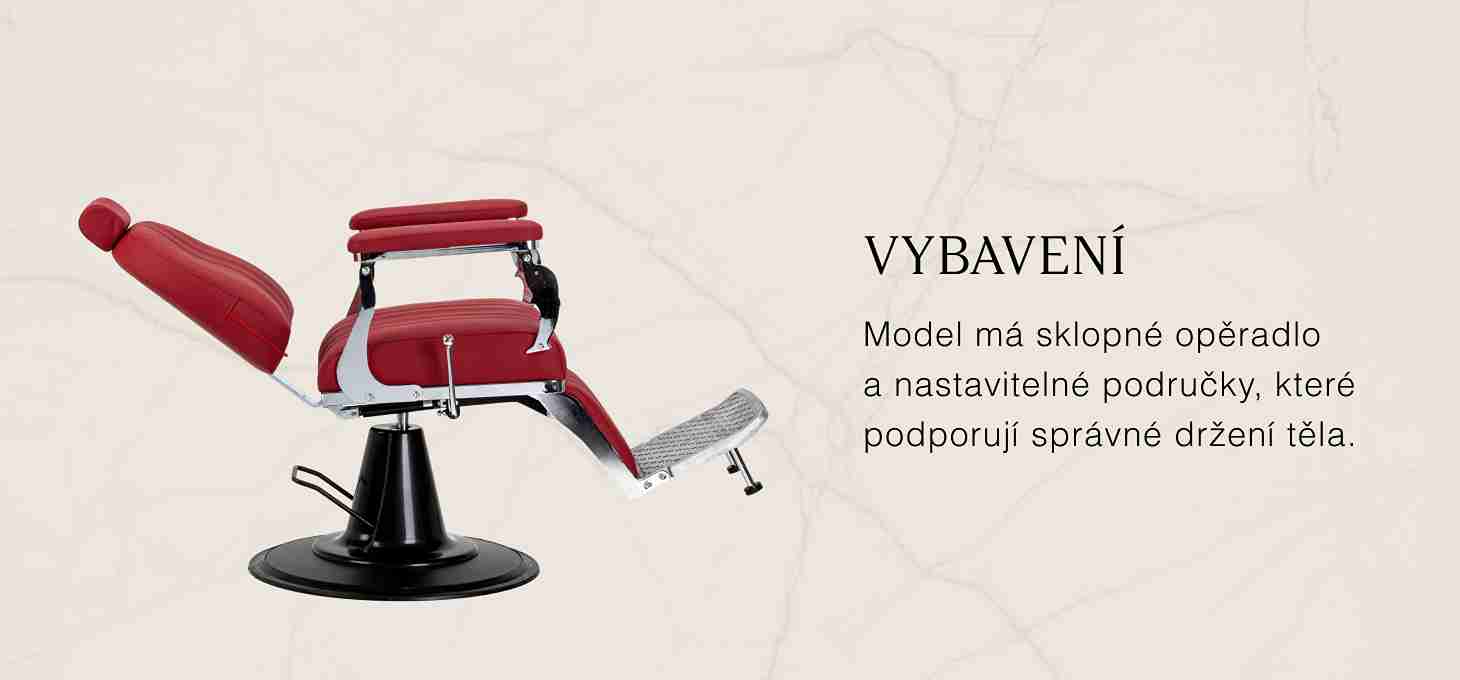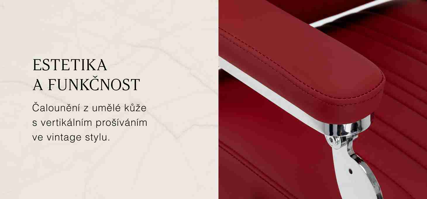 Stabilná základňa poskytuje bezpečnú oporu a vysoký komfort používania. Sedadlo je vyplnené penou odolnou proti deformácii a čalúnené matnou syntetickou kožou, čo zaručuje dlhodobú odolnosť a pohodlie. Materiály sa vyznačujú odolnosťou proti vlhkosti a ľahkým čistením. Burgundské čalúnenie v kombinácii s kovovými chrómovými prvkami a dekoratívnou opierkou na nohy dodávajú stoličke výrazný, klasický charakter. Vertikálne prešívanie zdôrazňuje vintage štýl, ktorý perfektne zapadá do atmosféry profesionálnych holičstiev. Starostlivo prepracované detaily dodávajú celku reprezentatívny vzhľad a funkčný dizajn podporuje pohodlnú a efektívnu prácu.