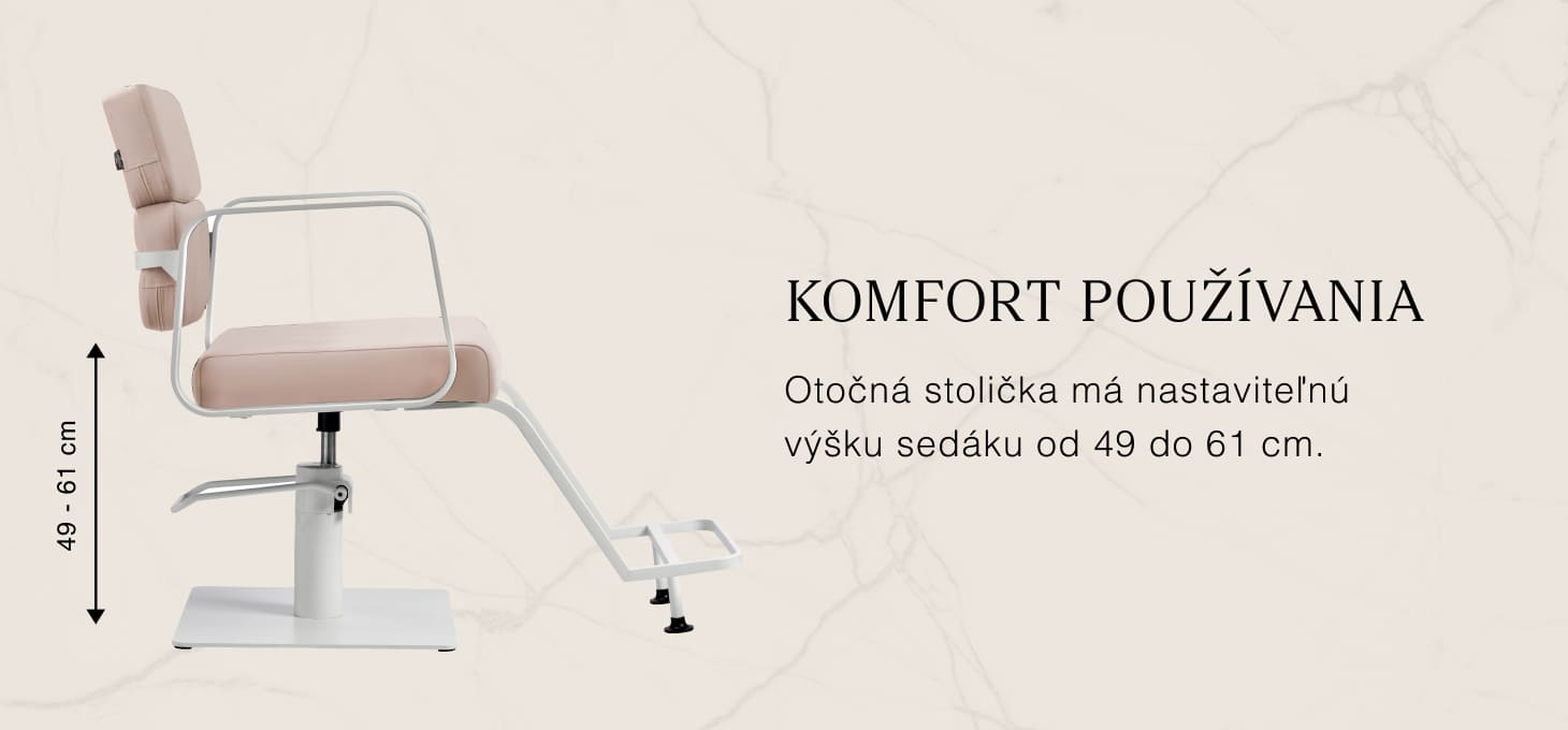Mechanizmus úplného otáčania, ktorým je stolička vybavená, zefektívňuje a spríjemňuje prácu kaderníka. Pevná plochá základňa štvorcového tvaru zaručuje stabilitu počas používania. Hladký povrch s matnou povrchovou úpravou dodáva tomuto kúsku elegantný vzhľad a vďaka nemu sa ľahko udržiava v čistote. Pohodlné sedadlo s penovou výplňou zaručuje vysokú úroveň komfortu aj počas dlhých hodín používania. Geometrické kovové podrúčky v zlatých tónoch umožňujú správne polohovanie ramien klienta - vďaka tomu nezabára hlavu do ramien ani sa nehrbí -, čo výrazne uľahčuje precízne ošetrenie vrátane strihania vlasov. Štýlová opierka nôh určená pre tento model poskytuje stabilnú oporu pre nohy používateľa.