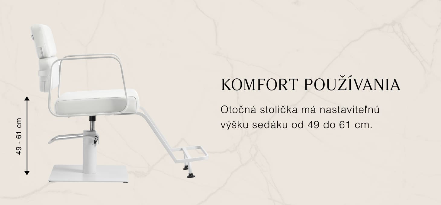 Mechanizmus úplného otáčania, ktorým je stolička vybavená, zefektívňuje a spríjemňuje prácu kaderníka. Pevná plochá základňa štvorcového tvaru zaručuje stabilitu počas používania. Hladký povrch s matnou povrchovou úpravou dodáva tomuto kúsku elegantný vzhľad a vďaka nemu sa ľahko udržiava v čistote. Pohodlné sedadlo s penovou výplňou zaručuje vysokú úroveň komfortu aj počas dlhých hodín používania. Geometrické kovové podrúčky v zlatých tónoch umožňujú správne polohovanie ramien klienta - vďaka tomu nezabára hlavu do ramien ani sa nehrbí -, čo výrazne uľahčuje precízne ošetrenie vrátane strihania vlasov. Štýlová opierka nôh určená pre tento model poskytuje stabilnú oporu pre nohy používateľa.