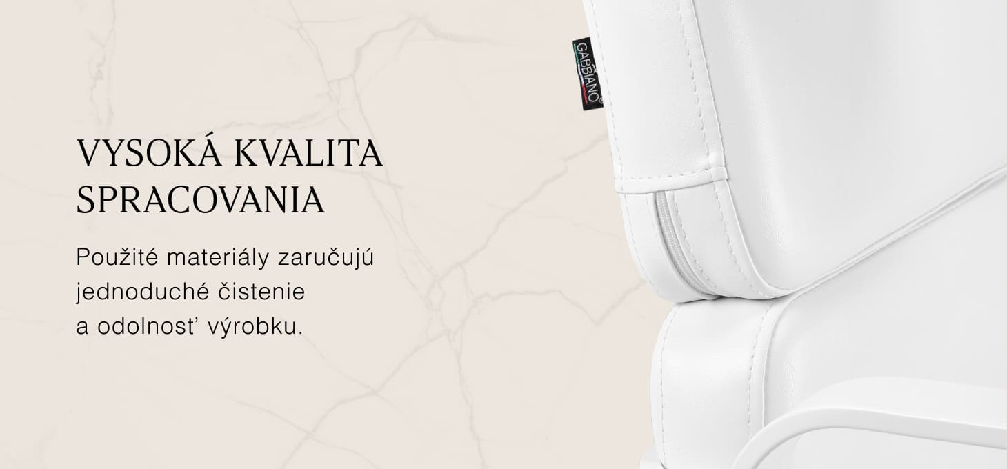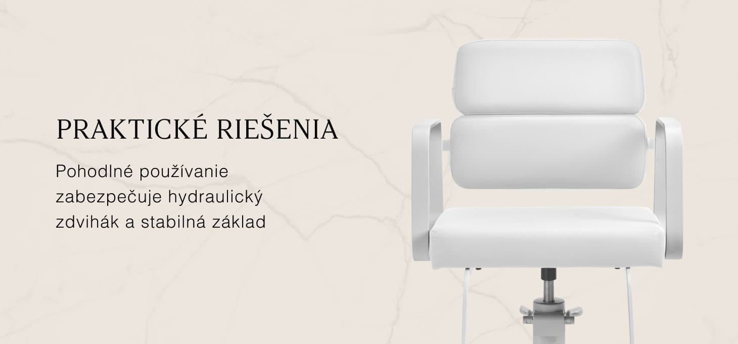 Výplň z odolnej peny odolnej voči deformáciám a čalúnenie z na dotyk príjemnej syntetickej kože zaručujú odolnosť nábytku a jeho pohodlné používanie po dlhú dobu. Vďaka nim je tiež odolný voči vlhkosti, trvácny a ľahko sa čistí. Poťah v bielých odtieňoch mu dodáva jedinečný charakter. Zariadenie sa vyznačuje moderným dizajnom, vďaka ktorému kreslo vyzerá skvele v mnohých profesionálnych salónoch.
