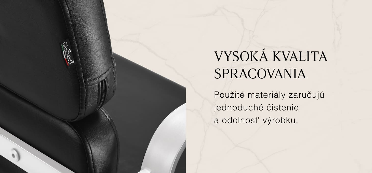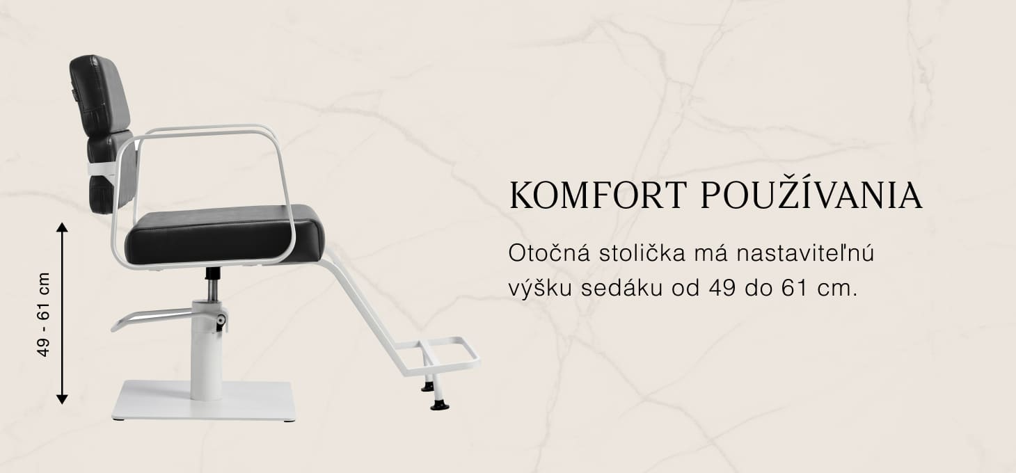 Mechanizmus úplného otáčania, ktorým je stolička vybavená, zefektívňuje a spríjemňuje prácu kaderníka. Pevná plochá základňa štvorcového tvaru zaručuje stabilitu počas používania. Hladký povrch s matnou povrchovou úpravou dodáva tomuto kúsku elegantný vzhľad a vďaka nemu sa ľahko udržiava v čistote. Pohodlné sedadlo s penovou výplňou zaručuje vysokú úroveň komfortu aj počas dlhých hodín používania. Geometrické kovové podrúčky v zlatých tónoch umožňujú správne polohovanie ramien klienta - vďaka tomu nezabára hlavu do ramien ani sa nehrbí -, čo výrazne uľahčuje precízne ošetrenie vrátane strihania vlasov. Štýlová opierka nôh určená pre tento model poskytuje stabilnú oporu pre nohy používateľa.