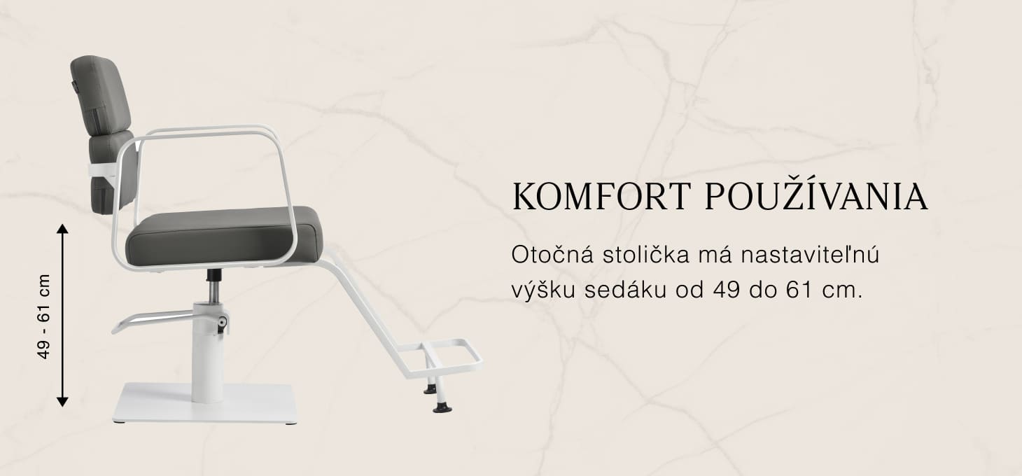 Mechanizmus úplného otáčania, ktorým je stolička vybavená, zefektívňuje a spríjemňuje prácu kaderníka. Pevná plochá základňa štvorcového tvaru zaručuje stabilitu počas používania. Hladký povrch s matnou povrchovou úpravou dodáva tomuto kúsku elegantný vzhľad a vďaka nemu sa ľahko udržiava v čistote. Pohodlné sedadlo s penovou výplňou zaručuje vysokú úroveň komfortu aj počas dlhých hodín používania. Geometrické kovové podrúčky v zlatých tónoch umožňujú správne polohovanie ramien klienta - vďaka tomu nezabára hlavu do ramien ani sa nehrbí -, čo výrazne uľahčuje precízne ošetrenie vrátane strihania vlasov. Štýlová opierka nôh určená pre tento model poskytuje stabilnú oporu pre nohy používateľa.