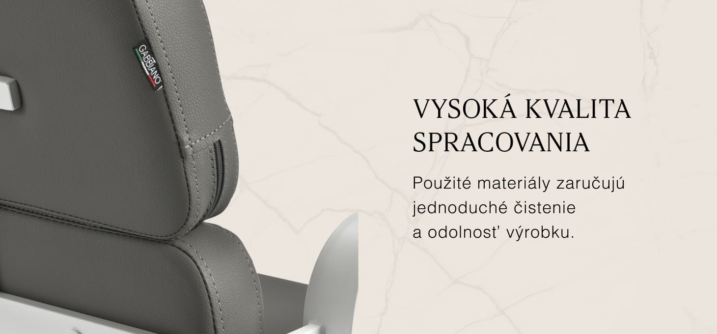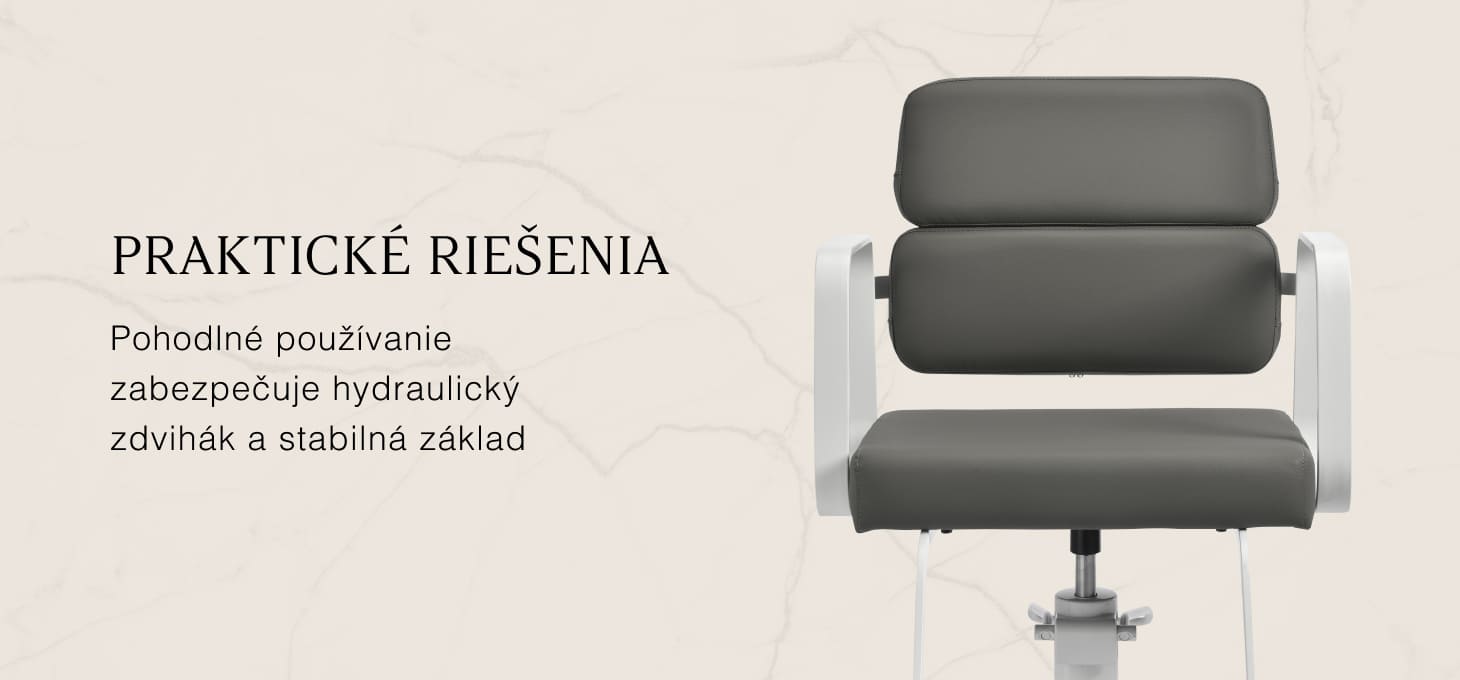 Výplň z odolnej peny odolnej voči deformáciám a čalúnenie z na dotyk príjemnej syntetickej kože zaručujú odolnosť nábytku a jeho pohodlné používanie po dlhú dobu. Vďaka nim je tiež odolný voči vlhkosti, trvácny a ľahko sa čistí. Poťah v šedých odtieňoch mu dodáva jedinečný charakter. Zariadenie sa vyznačuje moderným dizajnom, vďaka ktorému kreslo vyzerá skvele v mnohých profesionálnych salónoch.
