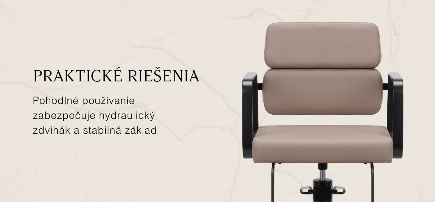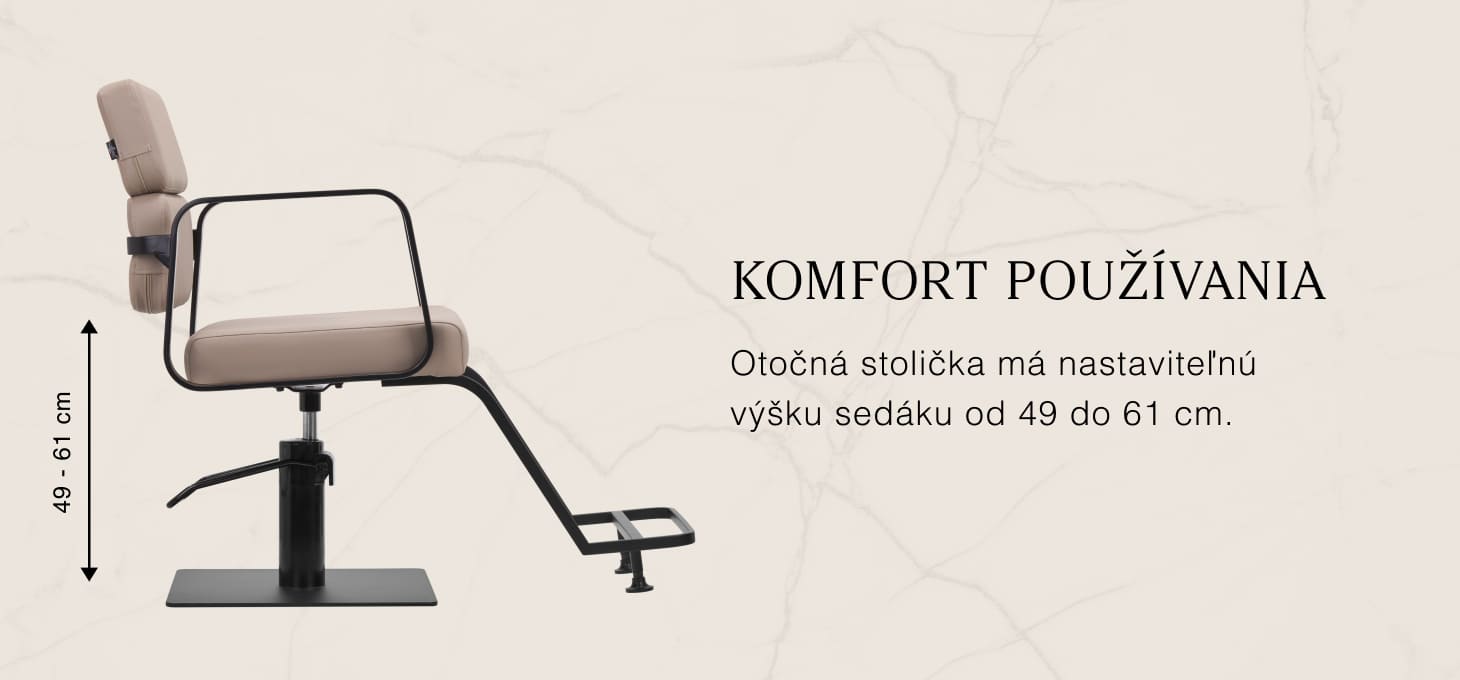 Odolný hydraulický zdvihák umožňuje nastaviť úroveň sedadla v rozsahu 49 - 61 cm - aj keď klient na stoličke sedí. Poskytuje ergonomickejšie pracovné prostredie, pretože umožňuje nastaviť úroveň sedadla podľa výšky klienta aj kaderníka. Vizuálne zaujímavé operadlo umožňuje pohodlnú polohu a poskytuje vynikajúcu oporu chrbta, čo je dôležité najmä pri ošetreniach trvajúcich niekoľko hodín. Veľkým plusom tohto modelu je otvor ponechaný medzi operadlom a sedadlom. Uľahčuje udržiavanie čistoty v salóne, pretože umožňuje ľahké vymetanie vlasov z každého zákutia kresla. To uľahčuje prípravu pracoviska medzi jednotlivými klientmi.