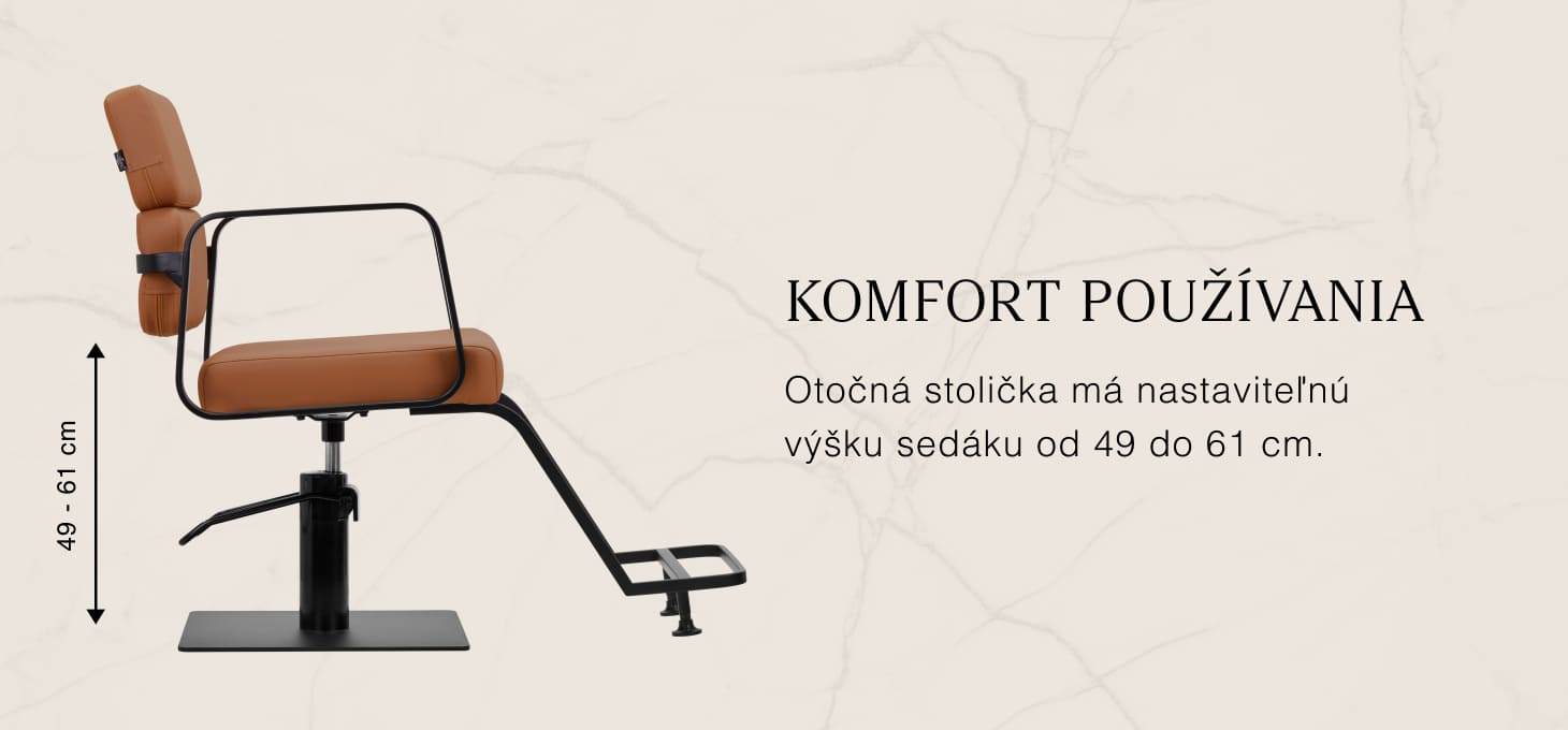 Mechanizmus úplného otáčania, ktorým je stolička vybavená, zefektívňuje a spríjemňuje prácu kaderníka. Pevná plochá základňa štvorcového tvaru zaručuje stabilitu počas používania. Hladký povrch s matnou povrchovou úpravou dodáva tomuto kúsku elegantný vzhľad a vďaka nemu sa ľahko udržiava v čistote. Pohodlné sedadlo s penovou výplňou zaručuje vysokú úroveň komfortu aj počas dlhých hodín používania. Geometrické kovové podrúčky v zlatých tónoch umožňujú správne polohovanie ramien klienta - vďaka tomu nezabára hlavu do ramien ani sa nehrbí -, čo výrazne uľahčuje precízne ošetrenie vrátane strihania vlasov. Štýlová opierka nôh určená pre tento model poskytuje stabilnú oporu pre nohy používateľa.