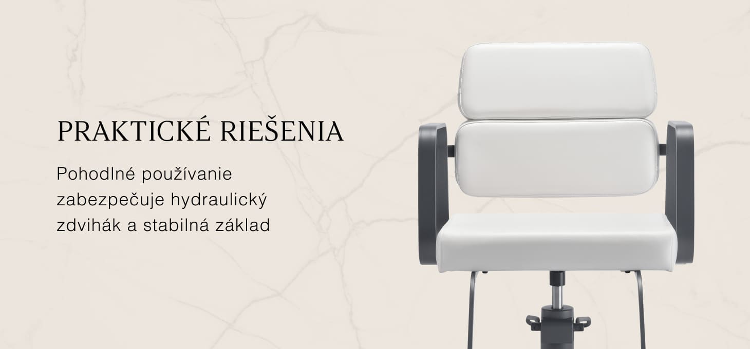 Mechanizmus úplného otáčania, ktorým je stolička vybavená, zefektívňuje a spríjemňuje prácu kaderníka. Pevná plochá základňa štvorcového tvaru zaručuje stabilitu počas používania. Hladký povrch s matnou povrchovou úpravou dodáva tomuto kúsku elegantný vzhľad a vďaka nemu sa ľahko udržiava v čistote. Pohodlné sedadlo s penovou výplňou zaručuje vysokú úroveň komfortu aj počas dlhých hodín používania. Geometrické kovové podrúčky v zlatých tónoch umožňujú správne polohovanie ramien klienta - vďaka tomu nezabára hlavu do ramien ani sa nehrbí -, čo výrazne uľahčuje precízne ošetrenie vrátane strihania vlasov. Štýlová opierka nôh určená pre tento model poskytuje stabilnú oporu pre nohy používateľa.