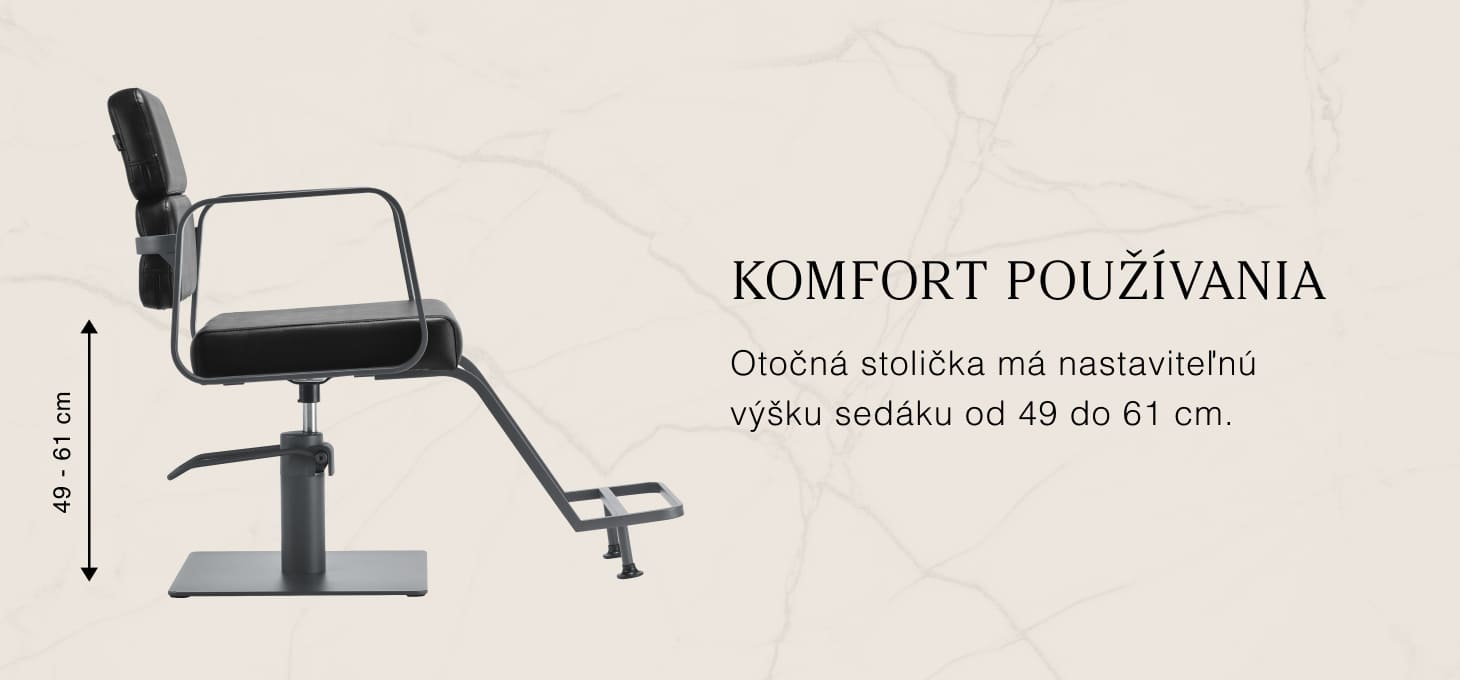Mechanizmus úplného otáčania, ktorým je stolička vybavená, zefektívňuje a spríjemňuje prácu kaderníka. Pevná plochá základňa štvorcového tvaru zaručuje stabilitu počas používania. Hladký povrch s matnou povrchovou úpravou dodáva tomuto kúsku elegantný vzhľad a vďaka nemu sa ľahko udržiava v čistote. Pohodlné sedadlo s penovou výplňou zaručuje vysokú úroveň komfortu aj počas dlhých hodín používania. Geometrické kovové podrúčky v zlatých tónoch umožňujú správne polohovanie ramien klienta - vďaka tomu nezabára hlavu do ramien ani sa nehrbí -, čo výrazne uľahčuje precízne ošetrenie vrátane strihania vlasov. Štýlová opierka nôh určená pre tento model poskytuje stabilnú oporu pre nohy používateľa.