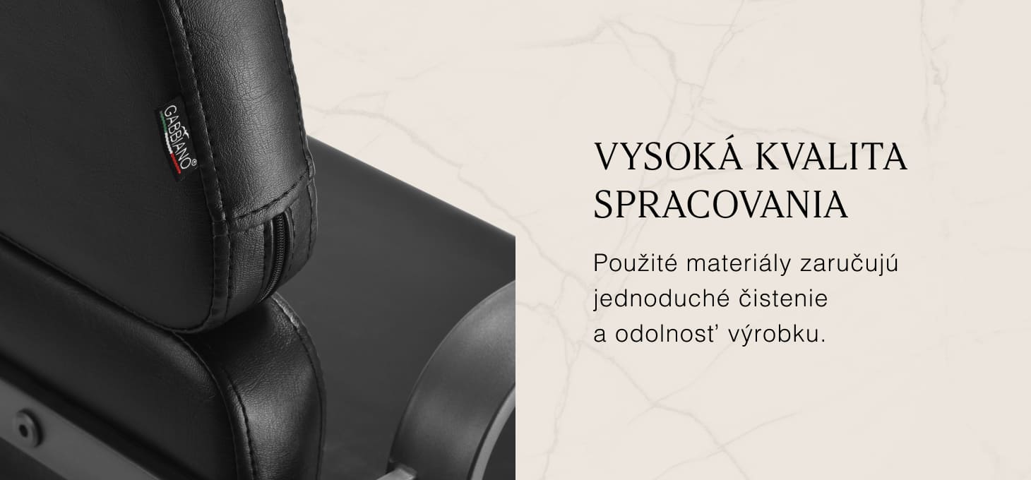 Výplň z odolnej peny odolnej voči deformáciám a čalúnenie z na dotyk príjemnej syntetickej kože zaručujú odolnosť nábytku a jeho pohodlné používanie po dlhú dobu. Vďaka nim je tiež odolný voči vlhkosti, trvácny a ľahko sa čistí. Poťah v čierných odtieňoch mu dodáva jedinečný charakter. Zariadenie sa vyznačuje moderným dizajnom, vďaka ktorému kreslo vyzerá skvele v mnohých profesionálnych salónoch.