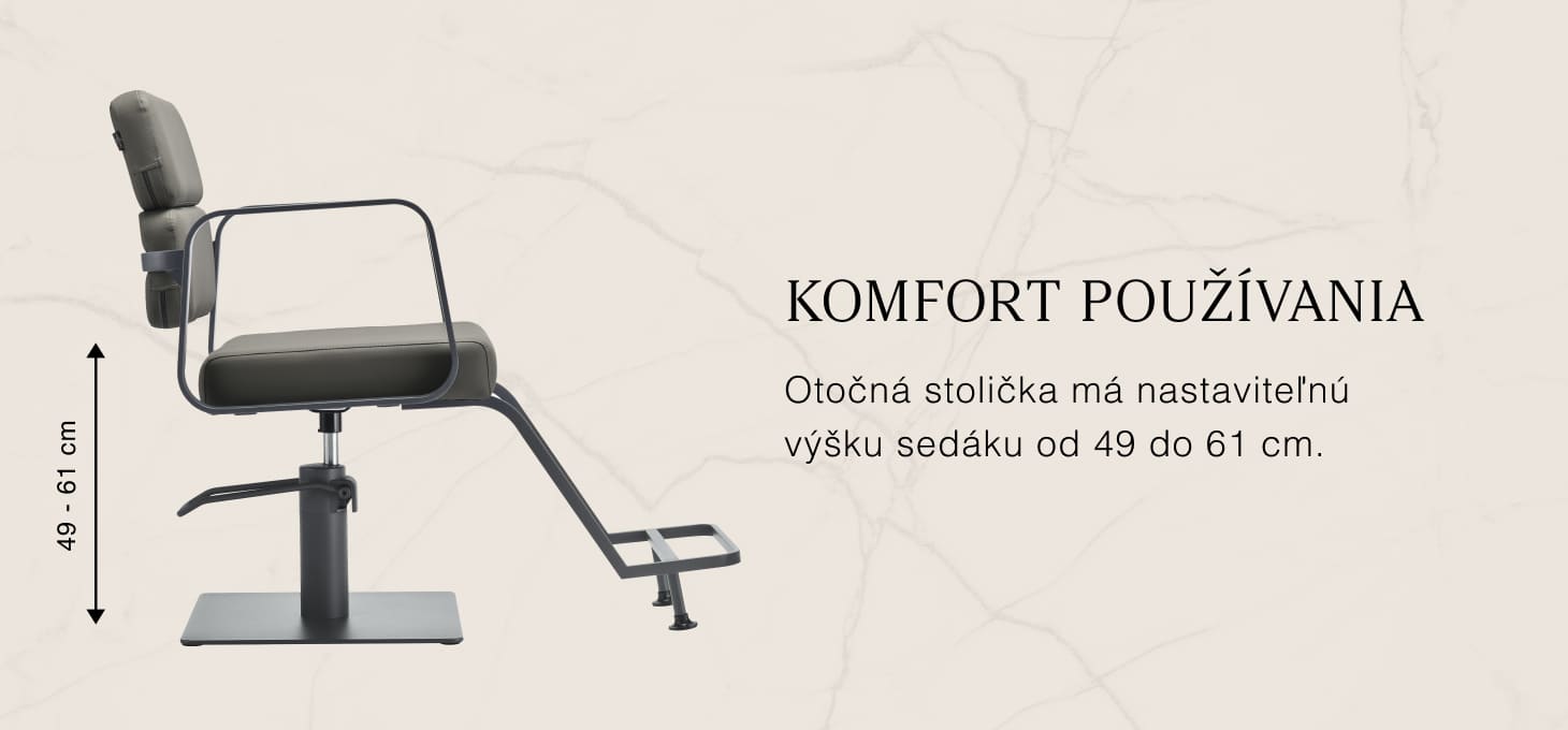 Mechanizmus úplného otáčania, ktorým je stolička vybavená, zefektívňuje a spríjemňuje prácu kaderníka. Pevná plochá základňa štvorcového tvaru zaručuje stabilitu počas používania. Hladký povrch s matnou povrchovou úpravou dodáva tomuto kúsku elegantný vzhľad a vďaka nemu sa ľahko udržiava v čistote. Pohodlné sedadlo s penovou výplňou zaručuje vysokú úroveň komfortu aj počas dlhých hodín používania. Geometrické kovové podrúčky v zlatých tónoch umožňujú správne polohovanie ramien klienta - vďaka tomu nezabára hlavu do ramien ani sa nehrbí -, čo výrazne uľahčuje precízne ošetrenie vrátane strihania vlasov. Štýlová opierka nôh určená pre tento model poskytuje stabilnú oporu pre nohy používateľa.