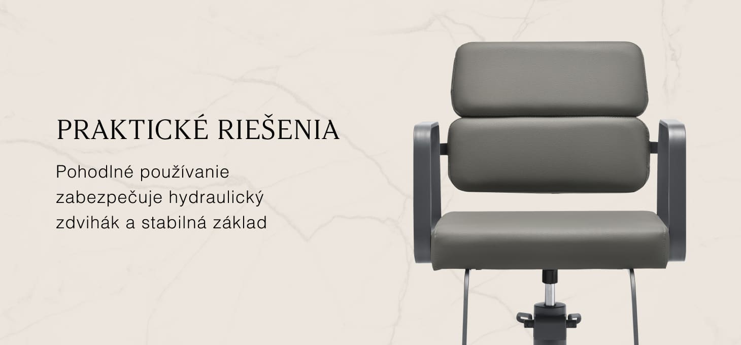 Odolný hydraulický zdvihák umožňuje nastaviť úroveň sedadla v rozsahu 49 - 61 cm - aj keď klient na stoličke sedí. Poskytuje ergonomickejšie pracovné prostredie, pretože umožňuje nastaviť úroveň sedadla podľa výšky klienta aj kaderníka. Vizuálne zaujímavé operadlo umožňuje pohodlnú polohu a poskytuje vynikajúcu oporu chrbta, čo je dôležité najmä pri ošetreniach trvajúcich niekoľko hodín. Veľkým plusom tohto modelu je otvor ponechaný medzi operadlom a sedadlom. Uľahčuje udržiavanie čistoty v salóne, pretože umožňuje ľahké vymetanie vlasov z každého zákutia kresla. To uľahčuje prípravu pracoviska medzi jednotlivými klientmi.