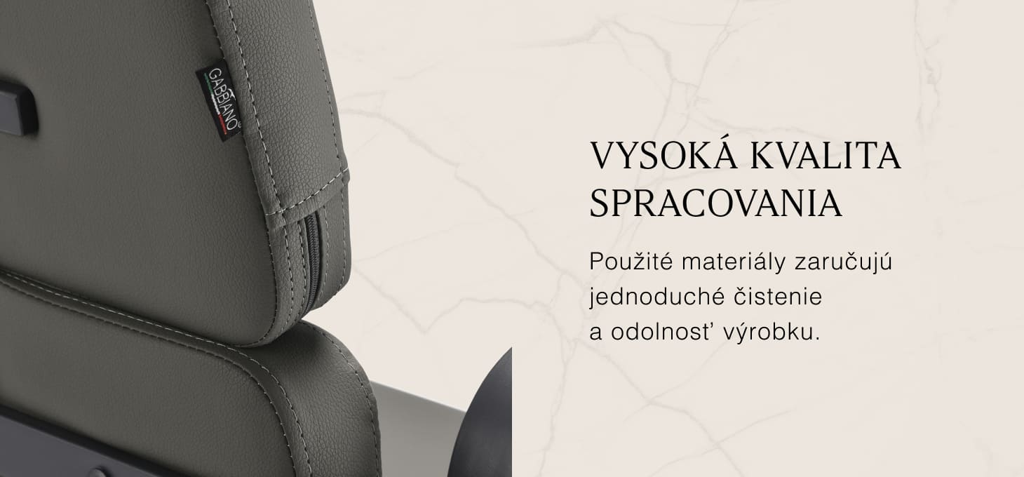 Výplň z odolnej peny odolnej voči deformáciám a čalúnenie z na dotyk príjemnej syntetickej kože zaručujú odolnosť nábytku a jeho pohodlné používanie po dlhú dobu. Vďaka nim je tiež odolný voči vlhkosti, trvácny a ľahko sa čistí. Poťah v šedých odtieňoch mu dodáva jedinečný charakter. Zariadenie sa vyznačuje moderným dizajnom, vďaka ktorému kreslo vyzerá skvele v mnohých profesionálnych salónoch.