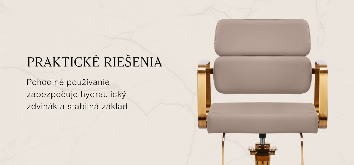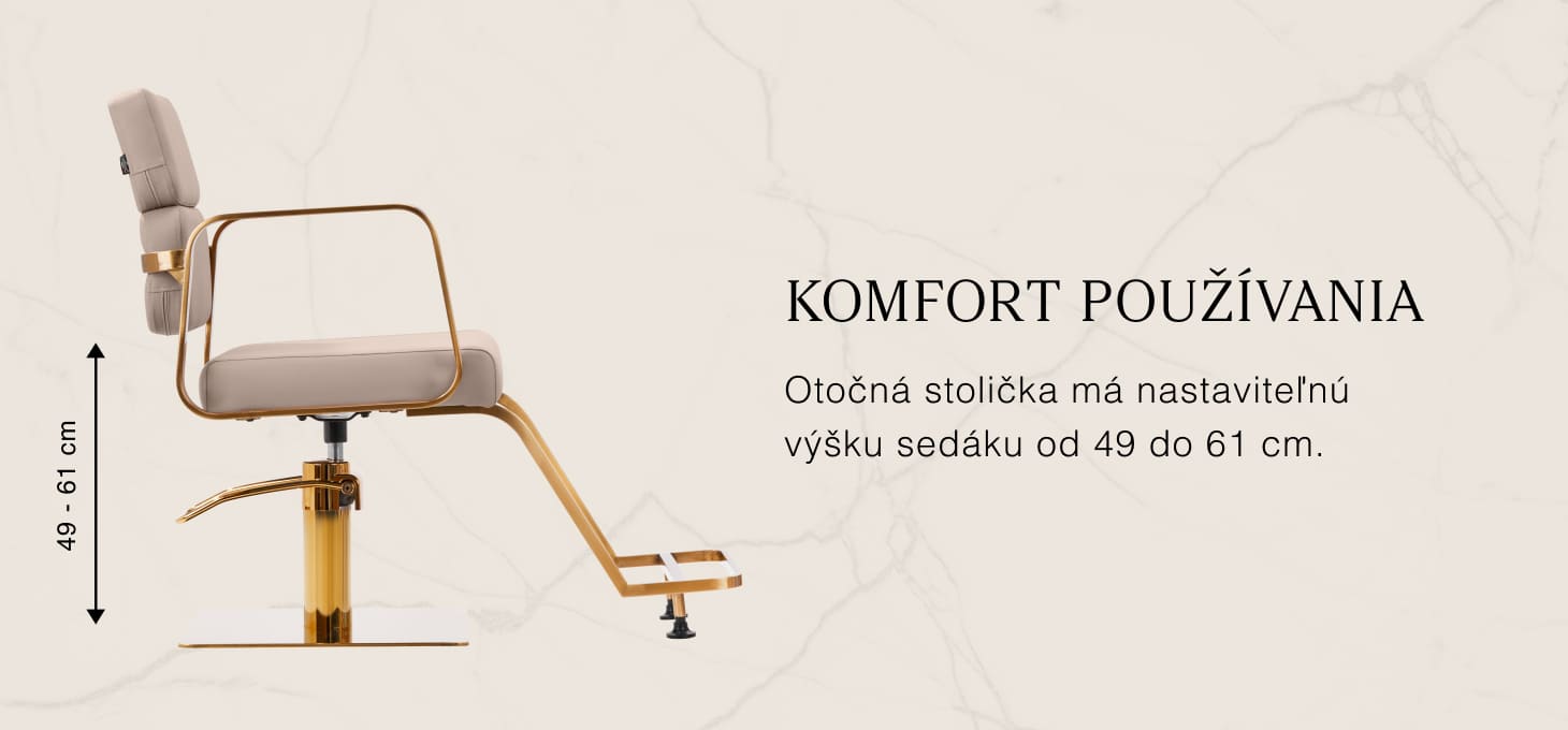 Mechanizmus úplného otáčania, ktorým je stolička vybavená, zefektívňuje a spríjemňuje prácu kaderníka. Pevná plochá základňa štvorcového tvaru zaručuje stabilitu počas používania. Hladký povrch s matnou povrchovou úpravou dodáva tomuto kúsku elegantný vzhľad a vďaka nemu sa ľahko udržiava v čistote. Pohodlné sedadlo s penovou výplňou zaručuje vysokú úroveň komfortu aj počas dlhých hodín používania. Geometrické kovové podrúčky v zlatých tónoch umožňujú správne polohovanie ramien klienta - vďaka tomu nezabára hlavu do ramien ani sa nehrbí -, čo výrazne uľahčuje precízne ošetrenie vrátane strihania vlasov. Štýlová opierka nôh určená pre tento model poskytuje stabilnú oporu pre nohy používateľa.