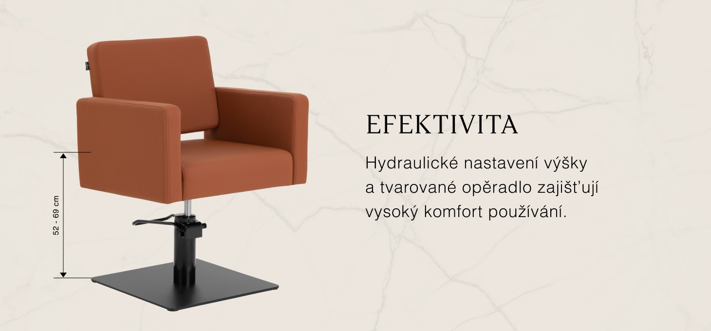 Odolný hydraulický zdvih umožňuje plynulé nastavenie výšky sedadla v rozmedzí 52-69 cm, a to aj počas používania stoličky. Toto riešenie podporuje ergonomickú prácu a umožňuje jednoduché nastavenie polohy tak, aby vyhovovala výške klienta aj kaderníka. Tvarované operadlo poskytuje stabilnú oporu chrbta a pohodlnú polohu, čo je obzvlášť dôležité pri dlhších procedúrach, čím sa výrazne zvyšuje komfort a spokojnosť zákazníka.
